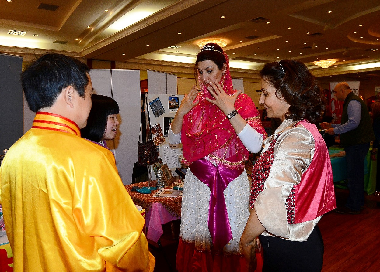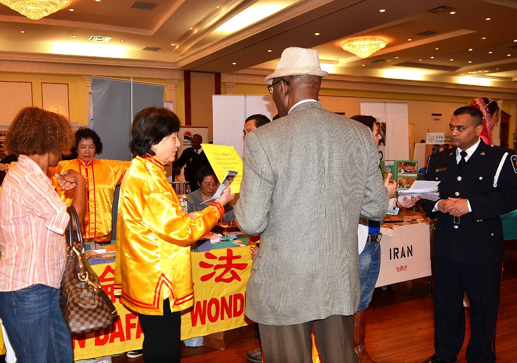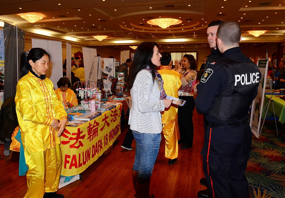 【明慧网二零一五年四月十四日】(明慧记者章韵多伦多报道)二零一五年四月十二日,加拿大大多伦多约克区警方在万锦活动中心(Markham Event Centre)举办一年一度的“国际消除种族歧视日”( International Day for the Elimination of Racial Discrimination)活动,吸引众多各族裔社区居民和社团参与。法轮功学员每年都应邀参加该活动,进行现场教功,展位上有不同族裔的人来学功。