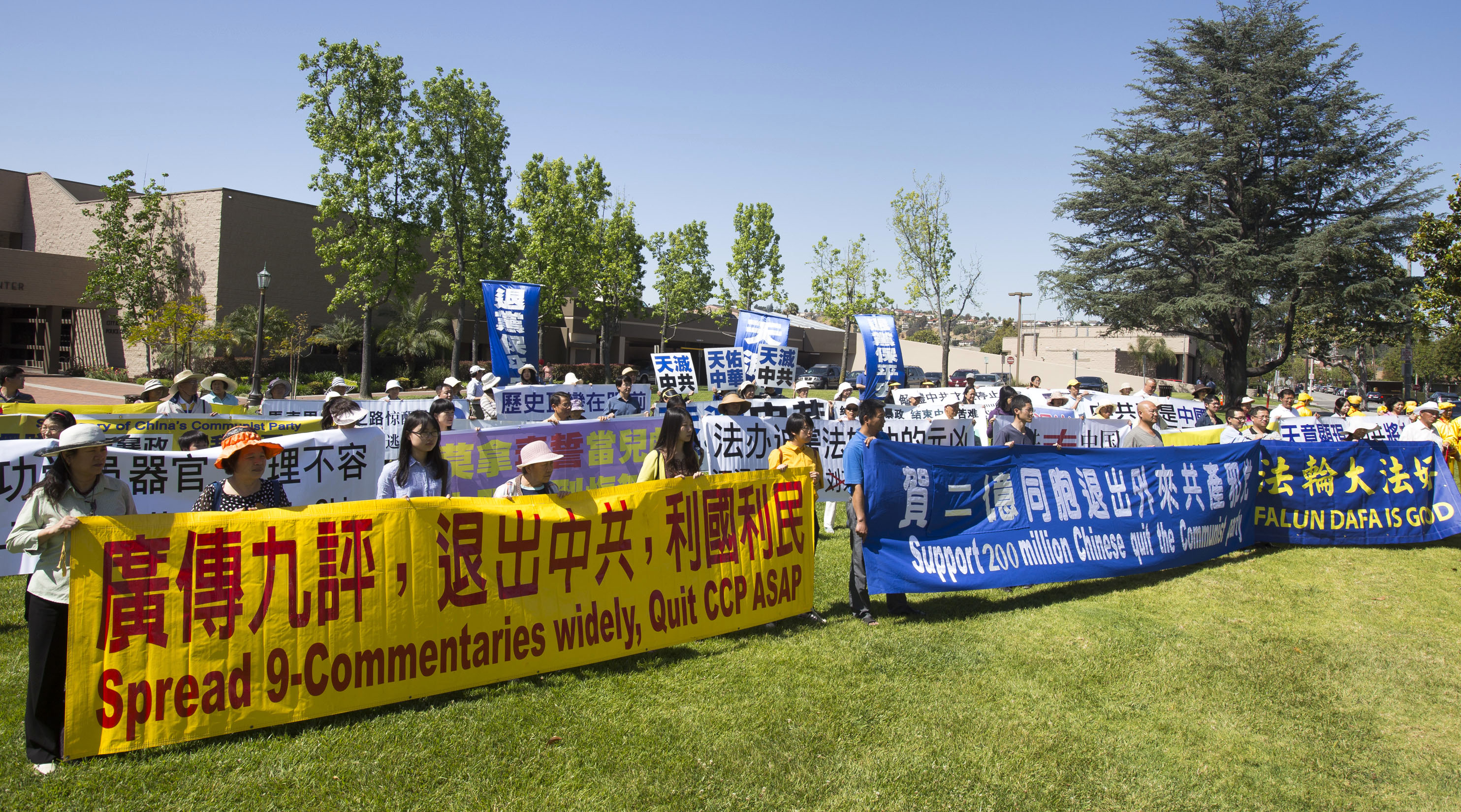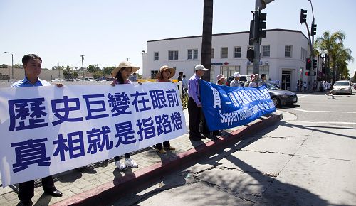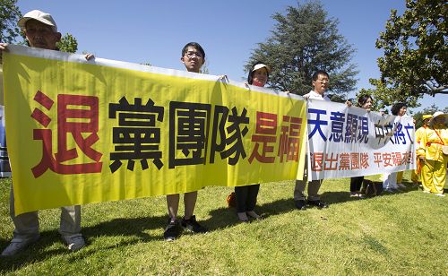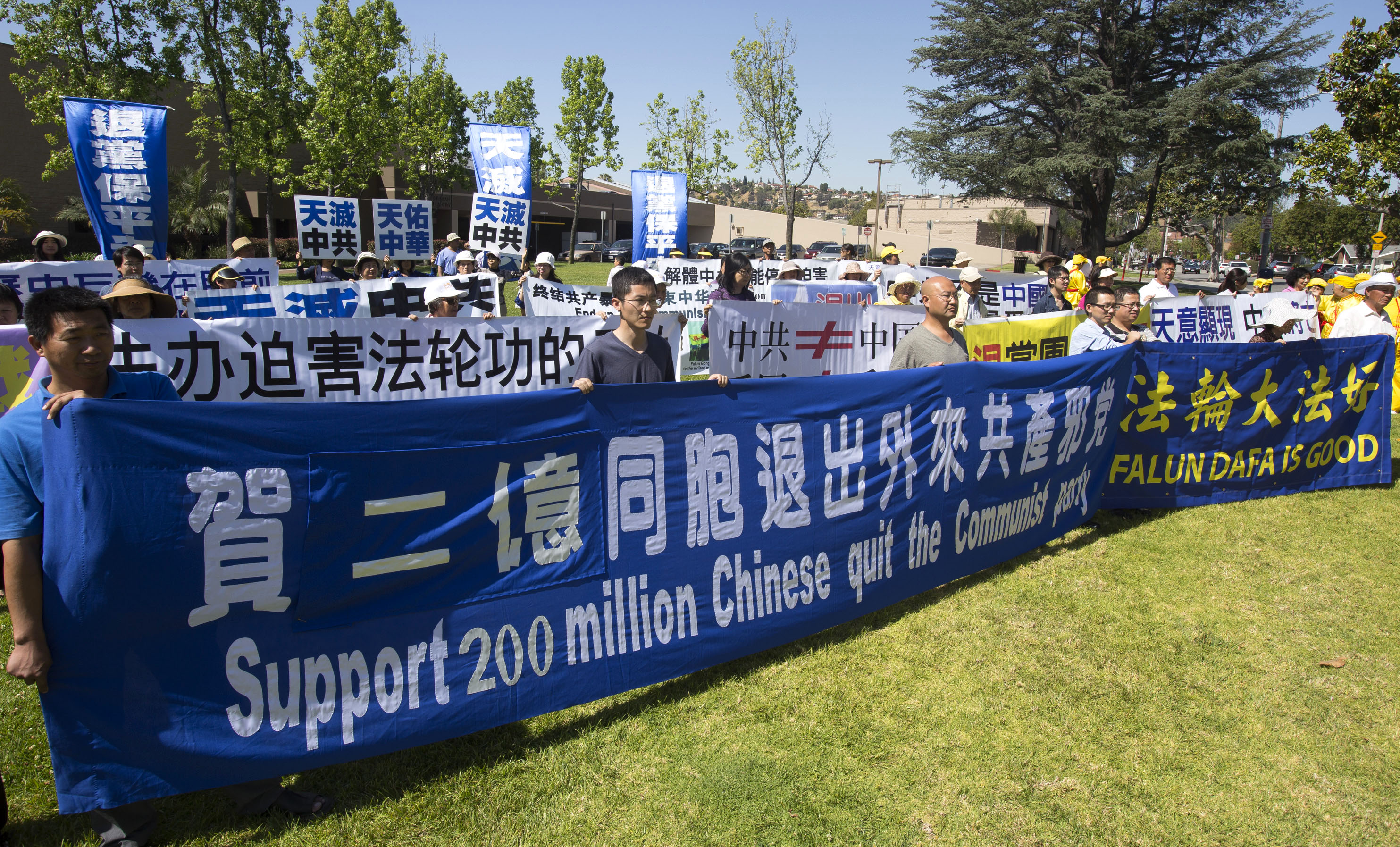 【明慧网二零一五年四月二十日】二零一五年四月十四日,在大纪元退党网站声明退出中共党、团、队组织的中国人已经超过了二亿人。四月十八日,美国洛杉矶退党服务中心义工及支持者在华人聚居区蒙特利公园市市政厅前举行集会声援二亿人三退,并表示期待更多中国人觉醒,尽快退出中共邪党及其团队组织。