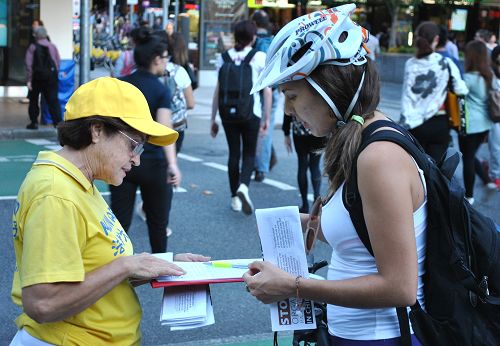 【明慧网二零一五年四月二十一日】(明慧记者陈心宁澳洲布里斯本采访报道)二零一五年四月十七日傍晚的布里斯本市中心,刚刚结束一周工作的上班族,在回家的路上遇见了身穿黄色上衣的法轮功学员,他们正在举横幅、发传单,告诉所有路过的人中共对法轮功学员惨无人道的人权迫害和“活摘”罪行。短短三个小时,有超过五百人签名支持法轮功,更有民众主动帮忙征签。