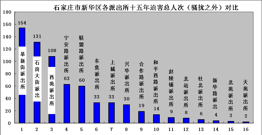 据明慧网报道的消息统计,十五年来,石家庄市新华区以革新街派出所、石岗大街派出所(包括红星分所)、西苑派出所、宁安路派出所、和联盟路派出所的迫害最为突出。如下图(一)所示。(由于当前的高压环境和信息封锁,这些数据只是实际发生案例的部分写照。)