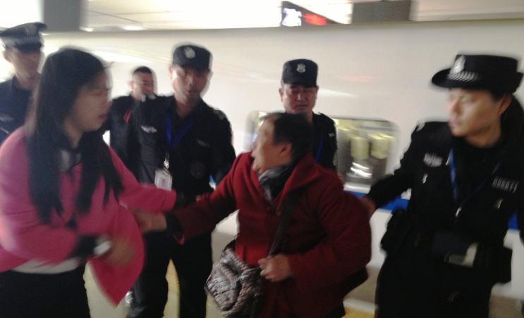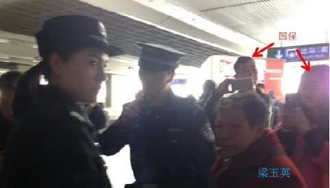 整个绑架过程,没有人没有出示证件,也不告知把人带往何处,如土匪一般,其中身穿制服的女警目露凶光。有一男一女两人拿着手机对绑架现场进行拍照,两人声称自己是国保警察。据了解,虹桥火车站警察将梁玉英老人绑架后,最后是交给这两名国保带走的。