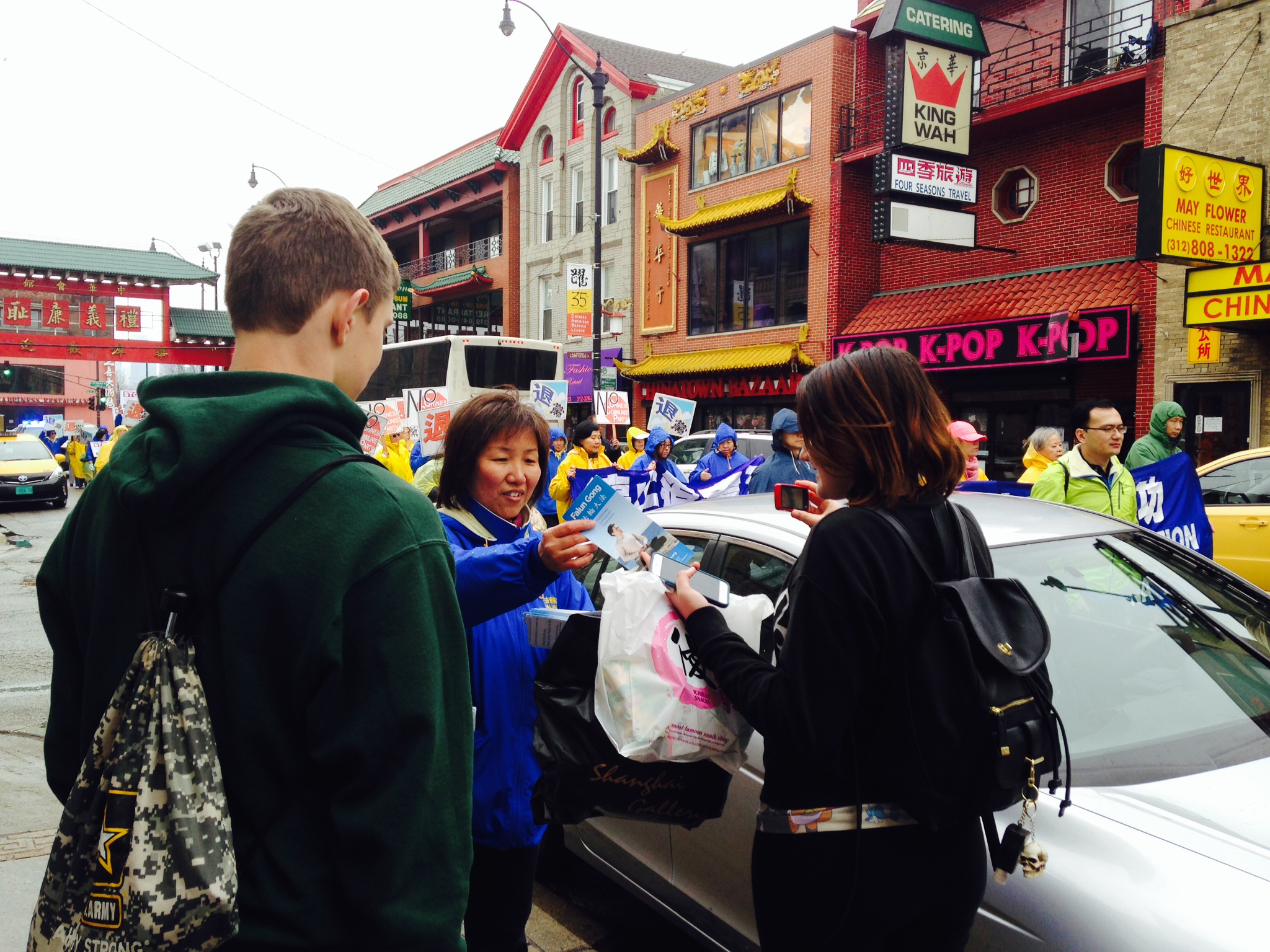 来自广州的大二学生于小姐和她的同学震惊地表示:“第一次看到法轮功游行,好震撼。好羡慕他们能够这样自由的表达自己想要的。”