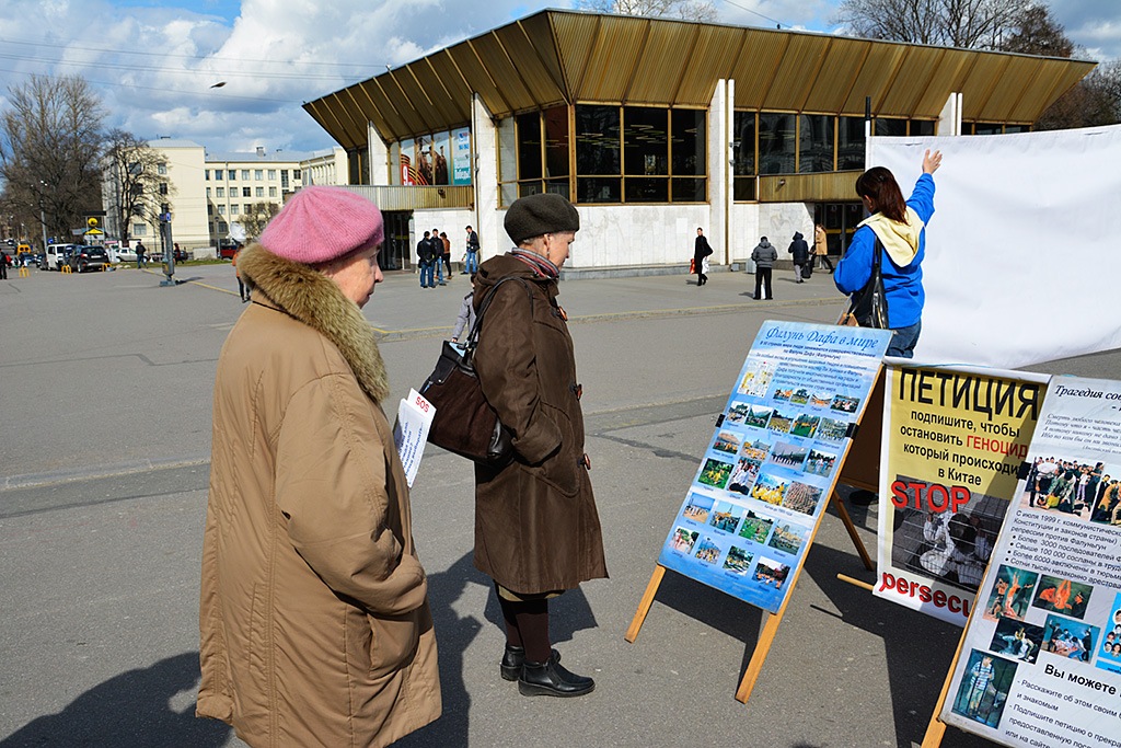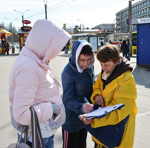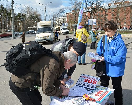 很多人对于因信仰遭到迫害反应强烈。一对夫妇详细阅读了展板内容并与学员们交谈之后毫不犹豫的签下自己的名字。他们表示,共产党一贯破坏人的道德、信仰。他们说,法轮功让人向善,让人身心健康,他们绝不相信法轮功修炼者会是坏人。他们说自己曾经因为儿子的离世悲痛不已,听到如此美好的法轮功音乐让他们感到平静。他们感谢法轮功学员关心在中国遭到迫害的人,并向俄罗斯人传递真相。