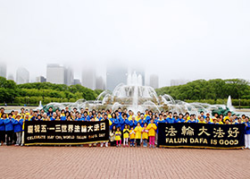 五月十日上午,芝加哥法轮功学员来到大喷泉旁集体炼功,庆祝法轮大法弘传二十三周年,并恭贺李洪志师尊华诞。