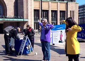 五月九日,芬兰法轮功学员在赫尔辛基火车站举办活动,喜迎世界法轮大法日,并庆祝法轮大法传世二十三周年。