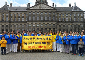 五月九日,荷兰法轮功学员来到首都阿姆斯特丹皇宫门前达姆广场举办活动,庆祝世界法轮大法日,恭祝师尊华诞。