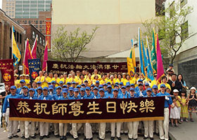 二零一五年五月九日,加拿大蒙特利尔法轮功学员举行游行庆祝活动,欢庆法轮大法弘传二十三周年。