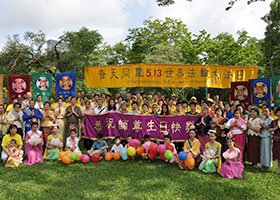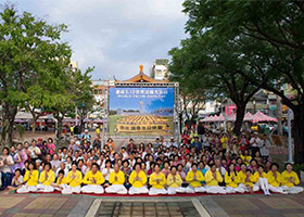 台湾屏东法轮功学员在屏东千禧公园户外广场举行集体炼功、正法之路图片展及艺文表演,庆祝“五•一三”世界法轮大法日。