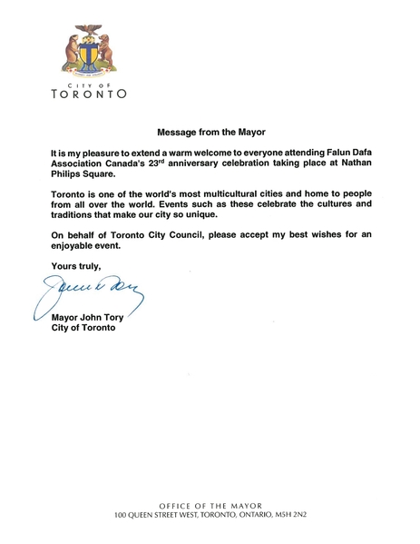 加拿大最大城市——多伦多的新晋市长庄德利(John Tory)在贺信中表示:“我非常荣幸能向在纳森菲利浦斯广场(Nathan Philips Square)参加加拿大法轮大法二十三周年庆典活动的每一位表达热情的问候。”