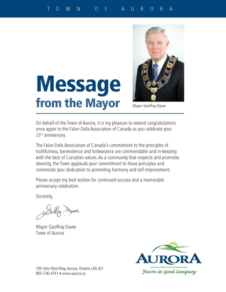 大多伦多地区奥罗拉(Aurora)市市长道威(Geoffrey Dawe)在贺信中写道:“作为奥罗拉的代表,我很荣幸能有机会在法轮大法洪传二十三周年庆典之时再一次送上我的祝贺。”