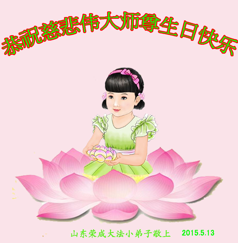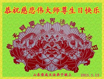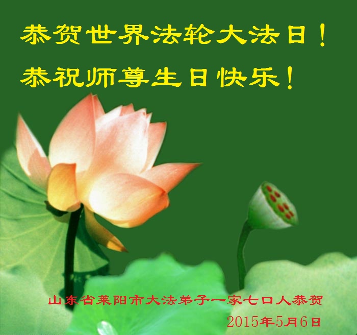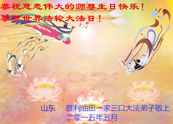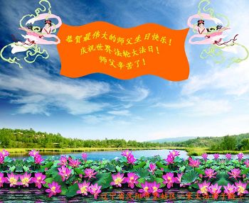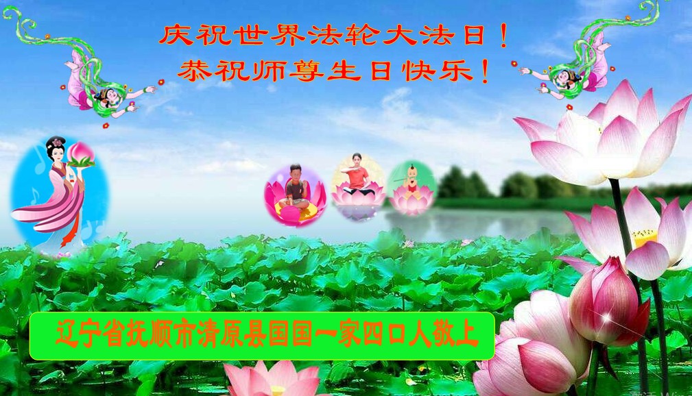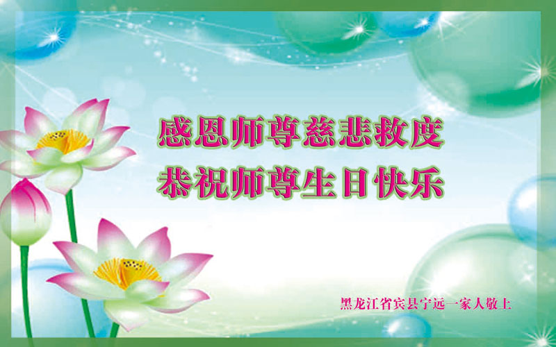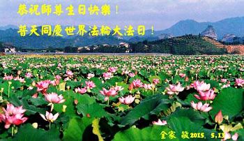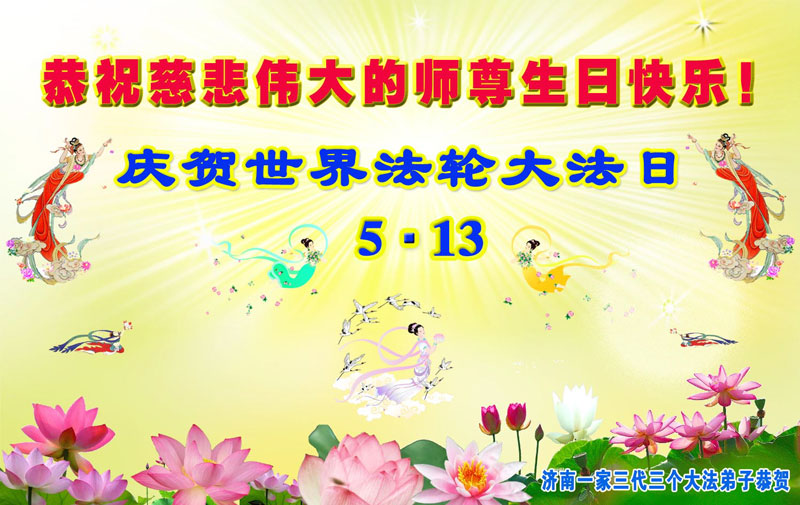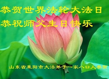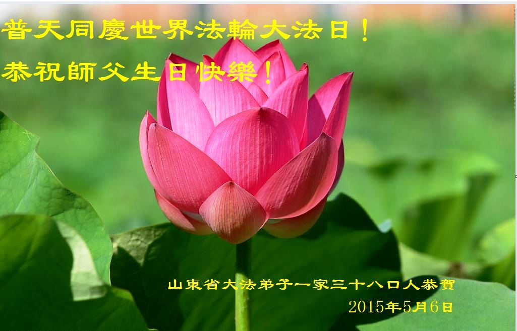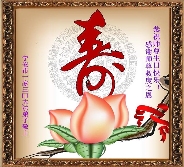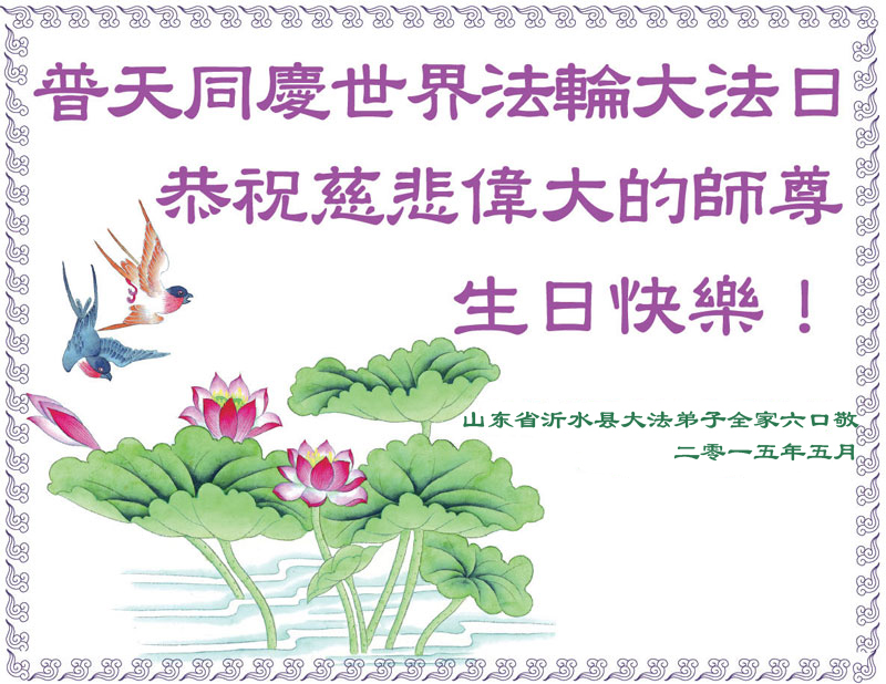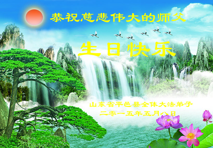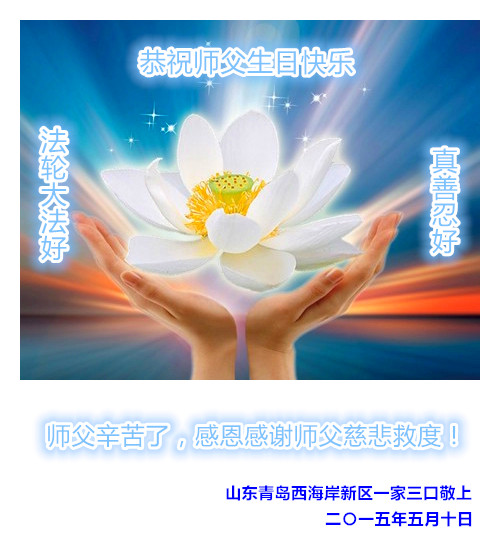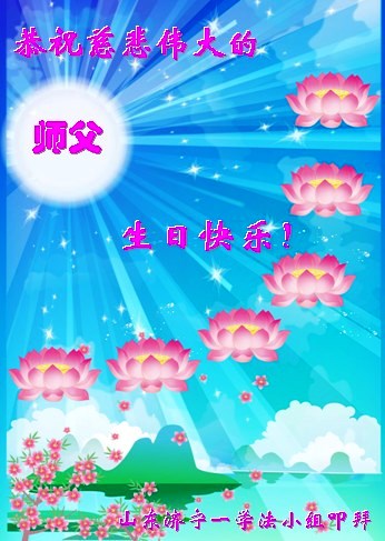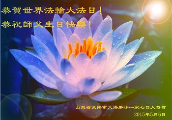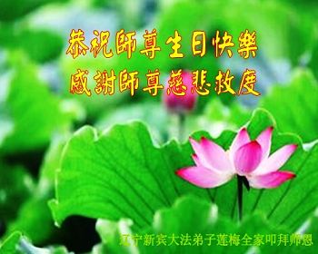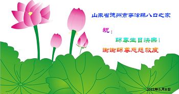 山东平原一大法弟子代表全家五口人,向慈悲伟大的师父问好!祝师父生日快乐!