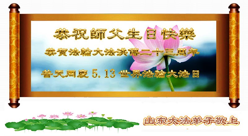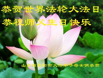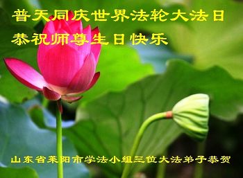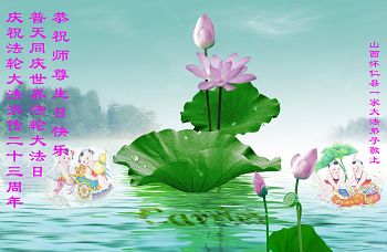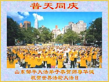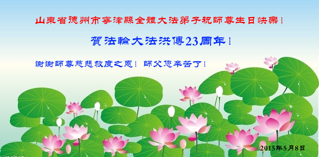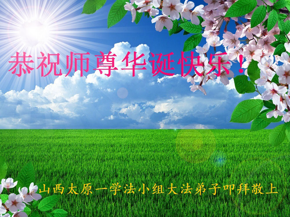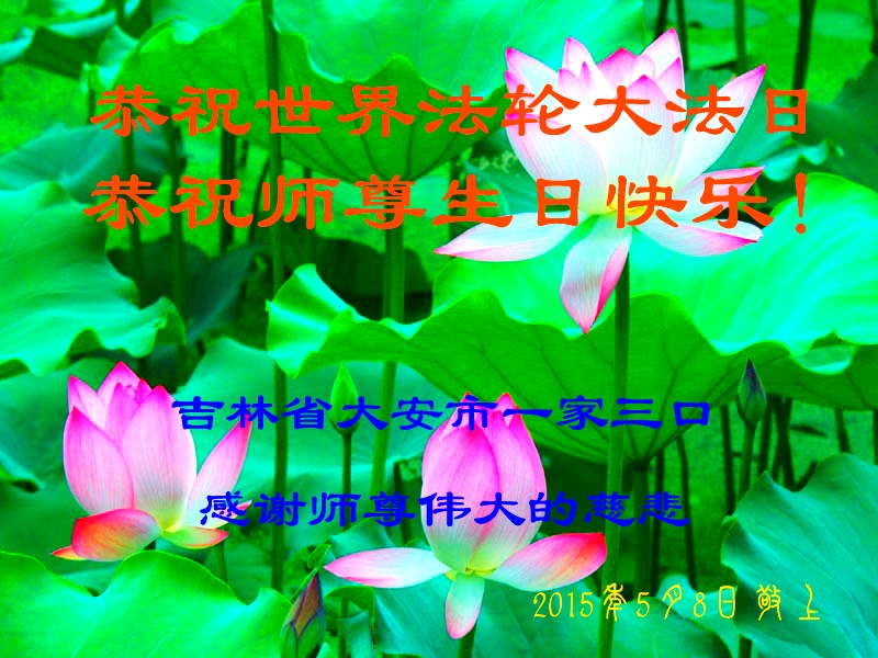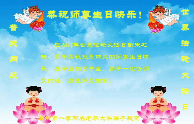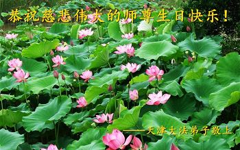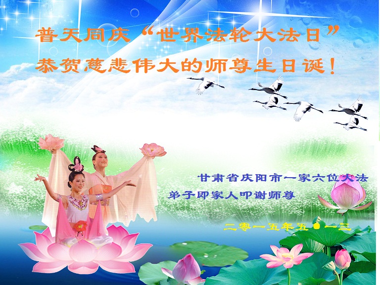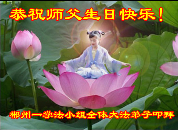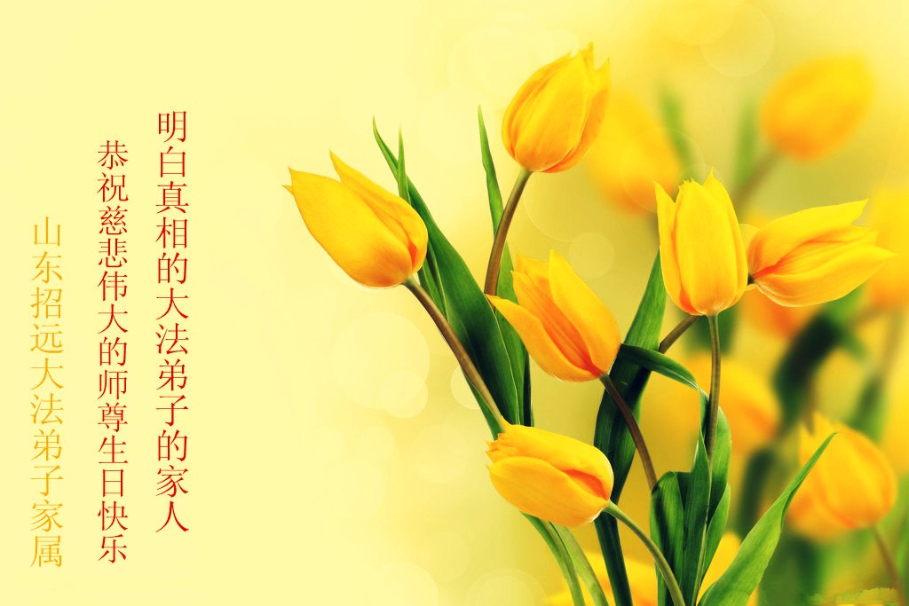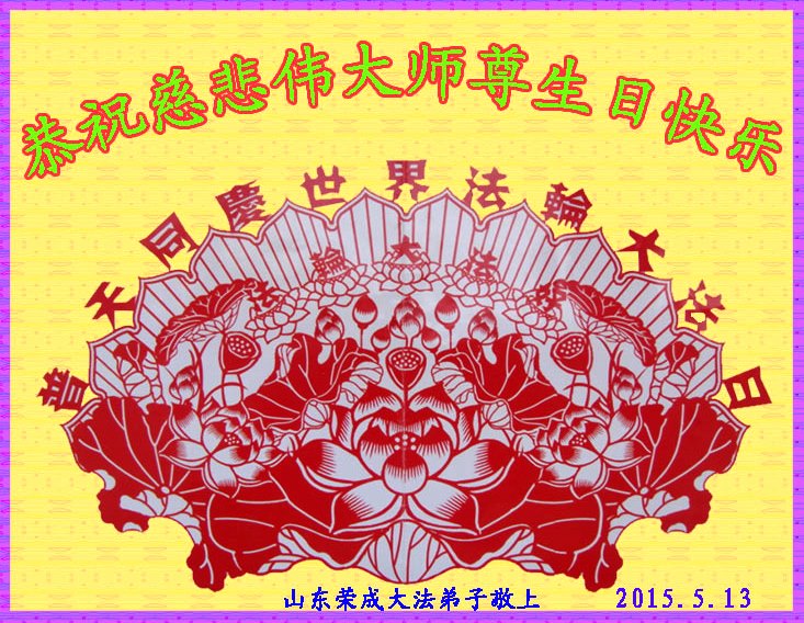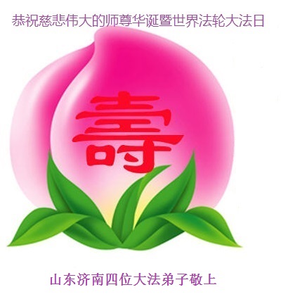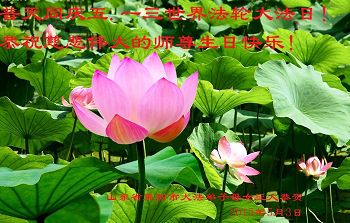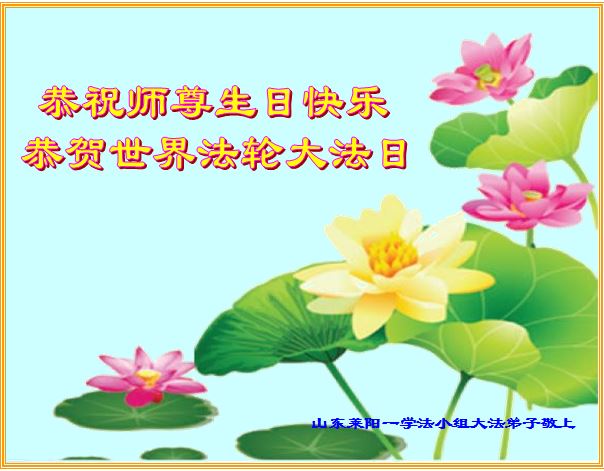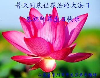 山东平原一大法弟子代表全家五口人,向慈悲伟大的师父问好!祝师父生日快乐!