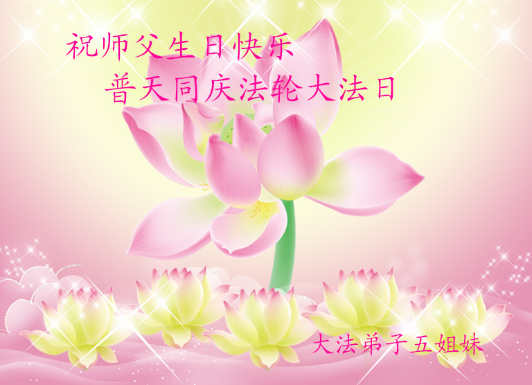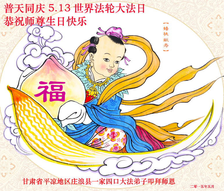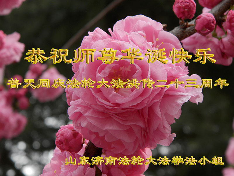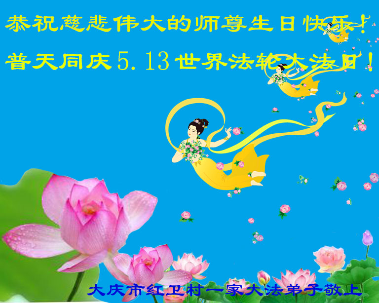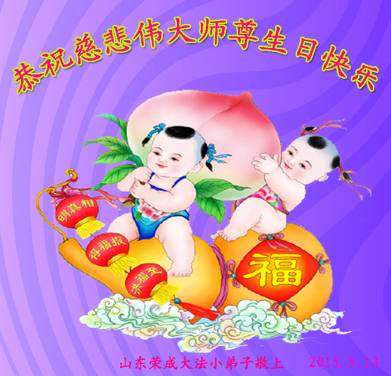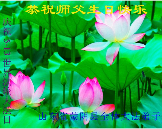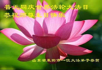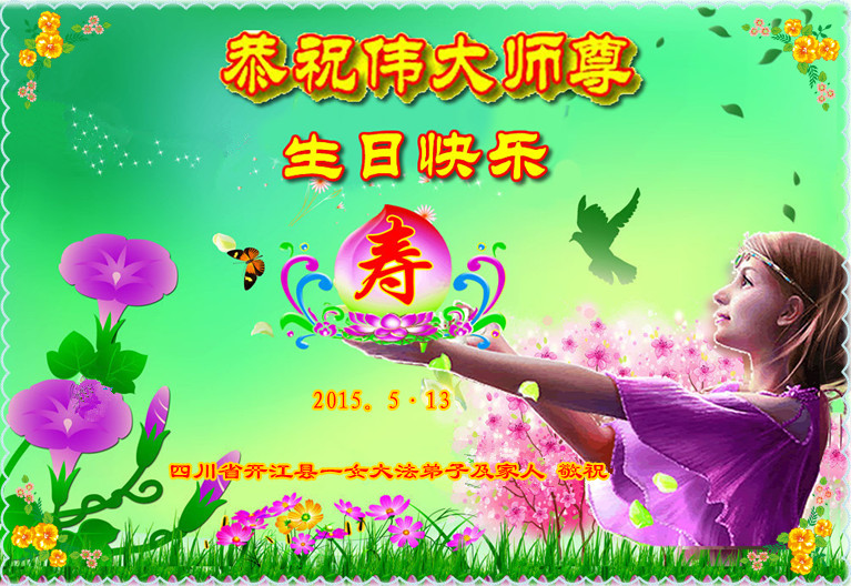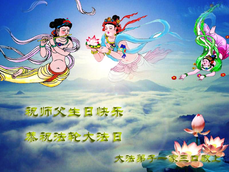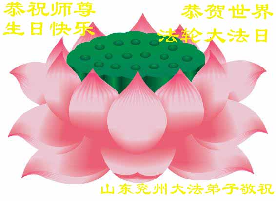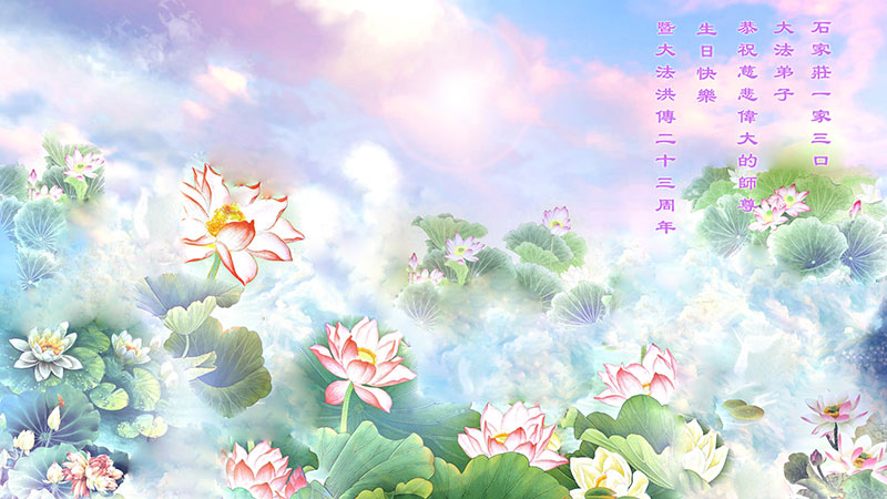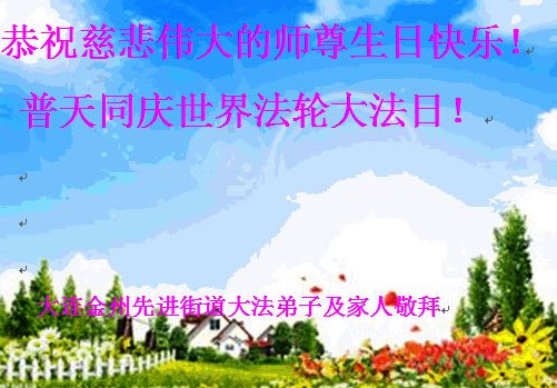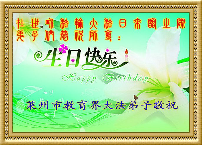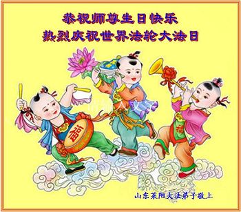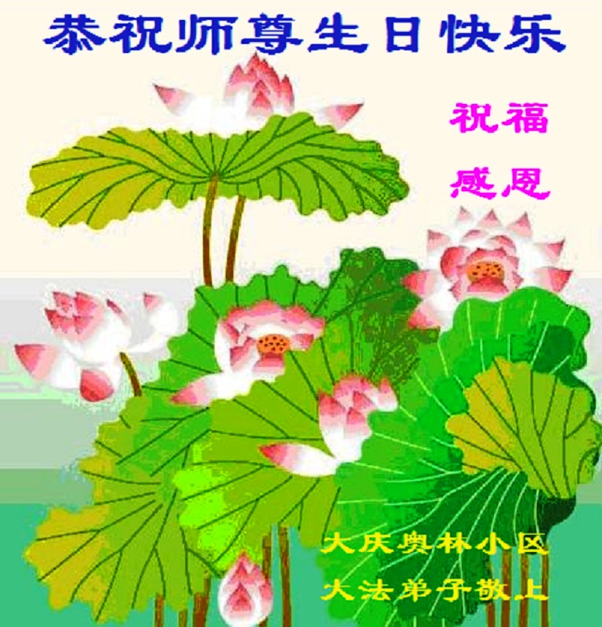山东平原一大法弟子代表全家五口人,向慈悲伟大的师父问好!祝师父生日快乐!
