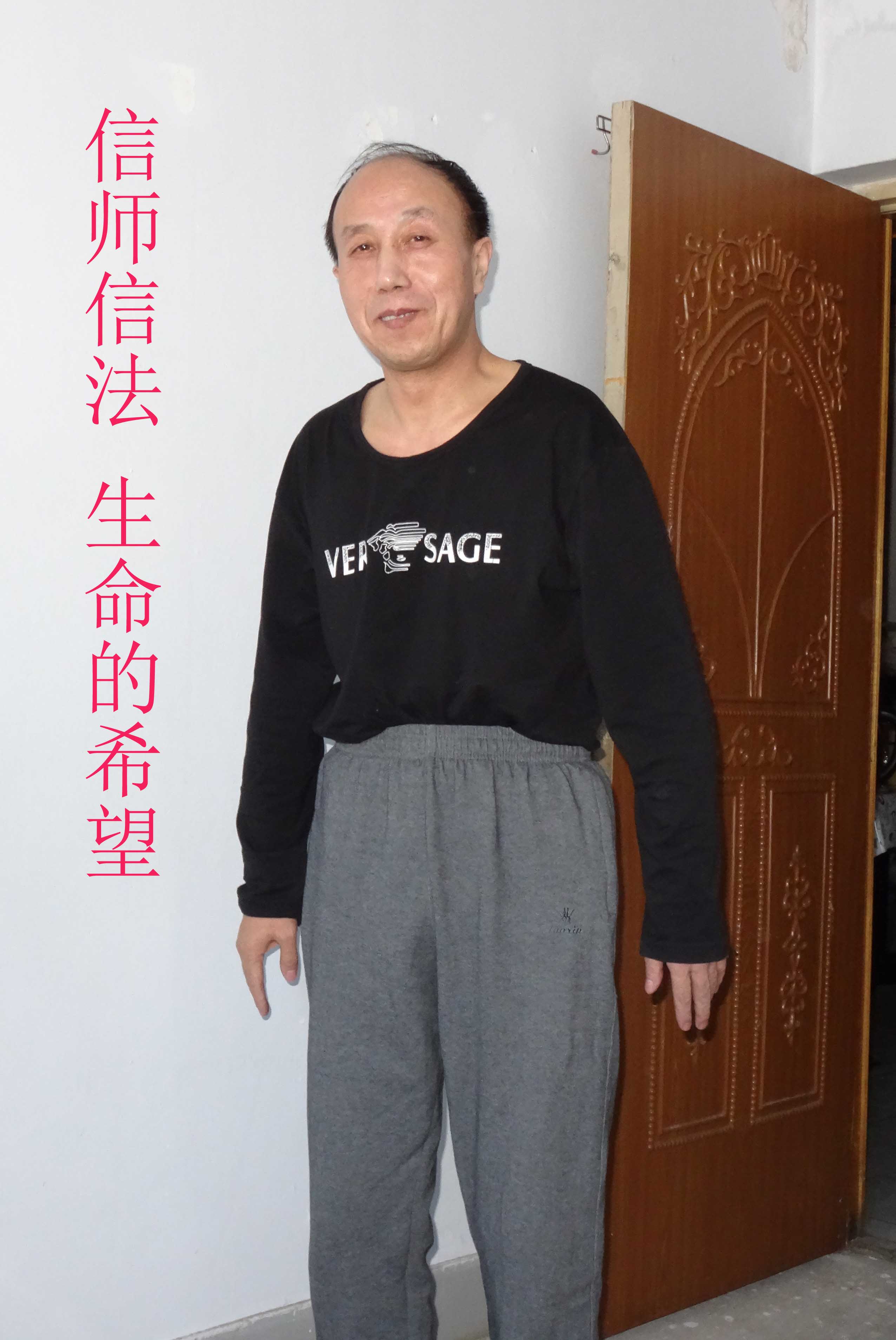 林泽华心想,只有法轮大法才能救自己。他学法,坐在椅子上炼功,平时生活中,他忍着疼痛尽量自理,不给家人添麻烦。奇迹发生了,被医生断定不可救治、瘫痪七年的林泽华在二零一五年三月站起来了,扶着墙能走了,能上楼了!