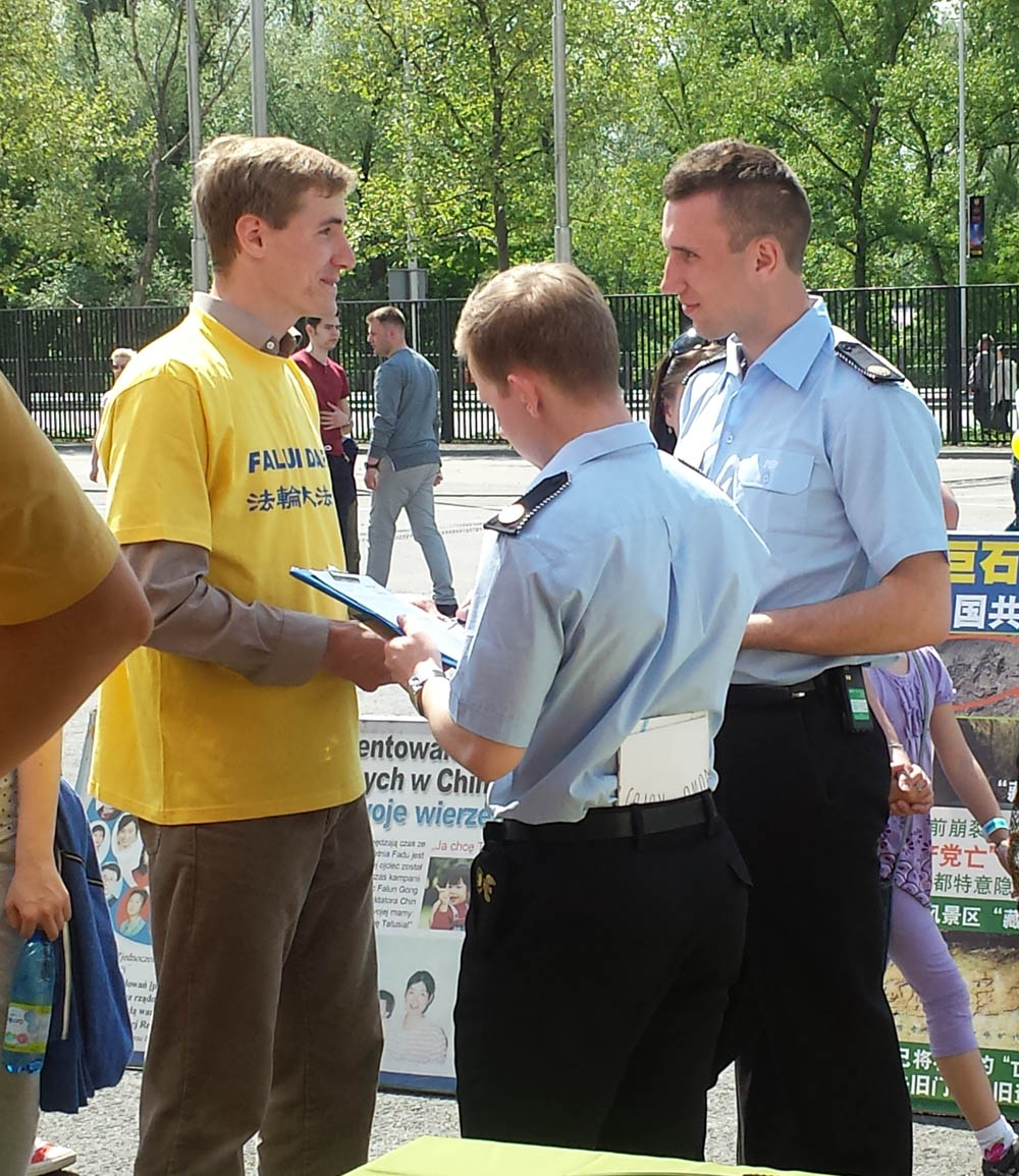 ![]() 在法轮大法展位的右边是波兰警察学会展位,警察们听真相后都在征签簿上签名 |