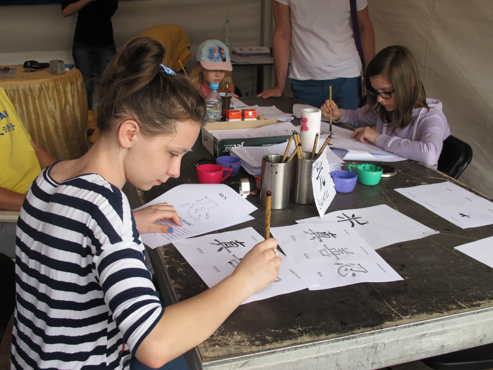 在毛笔字的教学处,法轮功学员也是一边教学写字的要领,一边讲解中国文化是神传文化。以及中共对中华文化的破坏和篡改,对坚持“真、善、忍”法理的法轮功学员的残酷迫害。也向人们介绍法轮功是恢复人的道德本性,返本归真的修炼,很多人听后都对法轮大法,法轮功学员甚至中国字肃然起敬,有人要求购买《转法轮》,有人表示一定要到炼功点上学炼法轮功。一位带着孩子做完莲花又来写毛笔字的女士说:"今天看了很多新科技感到很新奇,但真让我动心的还是你们这里,心胸好像变得很大,心里又安静又平和,真感觉坏人到这里也会变成好人了,法轮大法真好啊!”