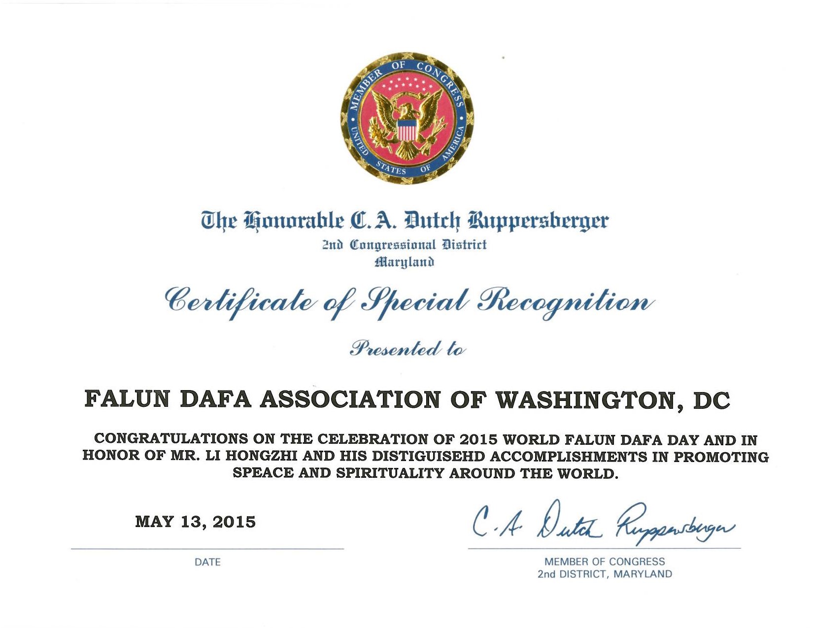 祝贺2015世界法轮大法日,并向李洪志先生致敬,对他为在全世界推动和平和精神的杰出贡献表示敬意。