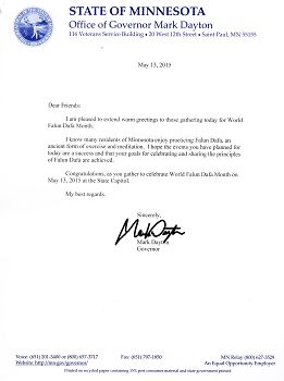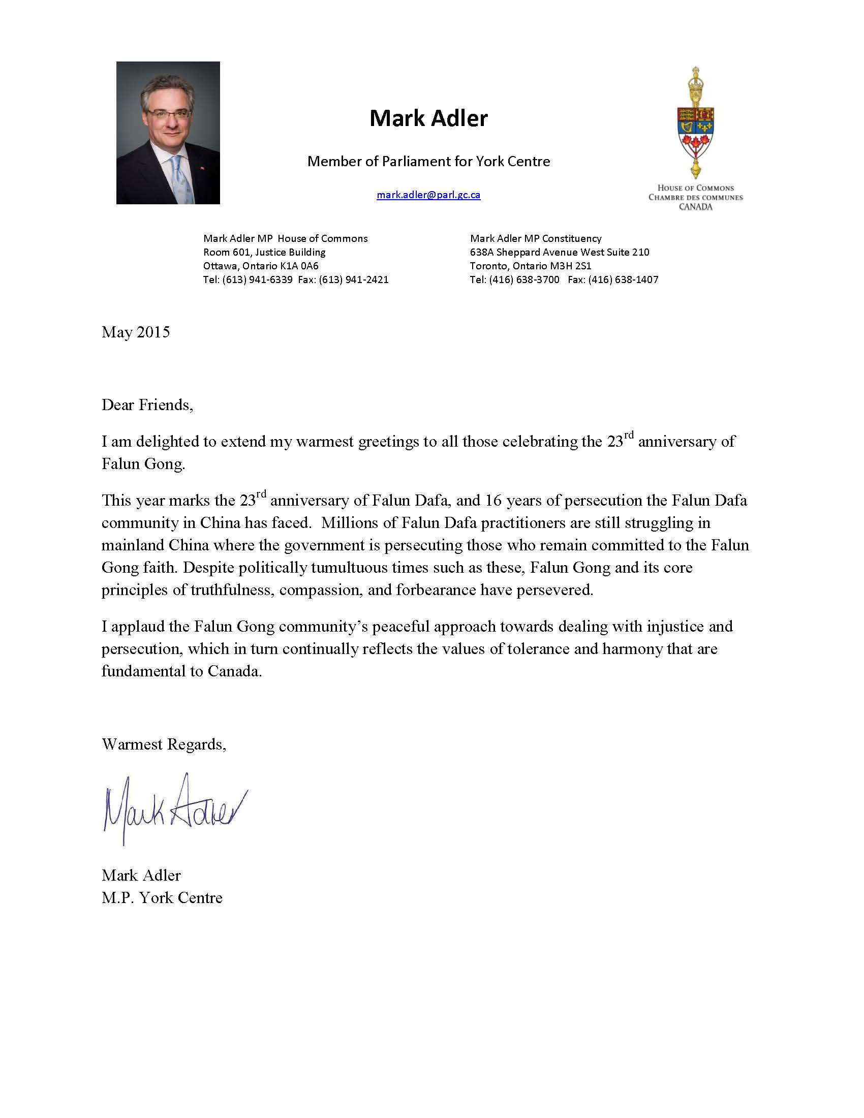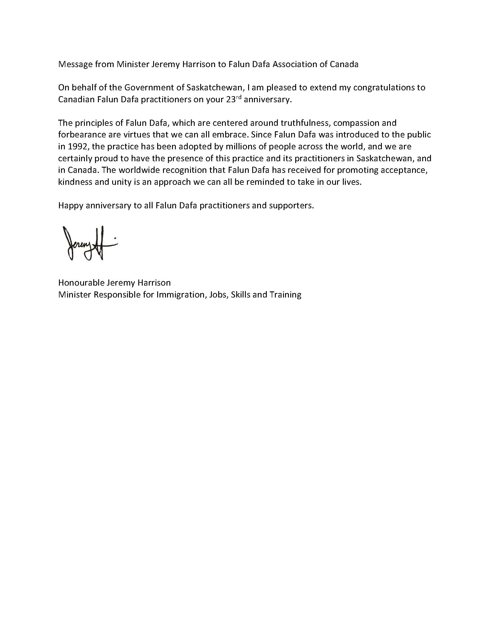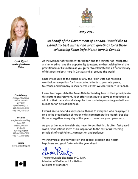 五月十三日,加拿大外交部长罗伯·尼克森(Rob Nicholson)先生致函加拿大法轮大法佛学会称,“ 我衷心祝愿加拿大各地二零一五年的庆祝活动圆满成功。法轮大法‘真善忍’的指导原则有助于建立充满活力的加拿大社会,在这里各族裔的信仰被珍视,人们自由信奉其宗教信仰的理念。”