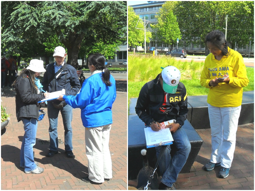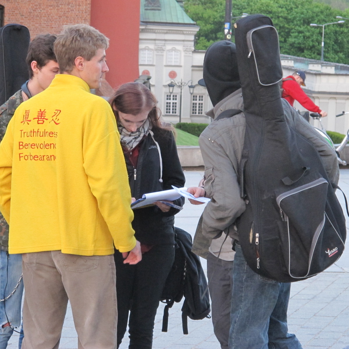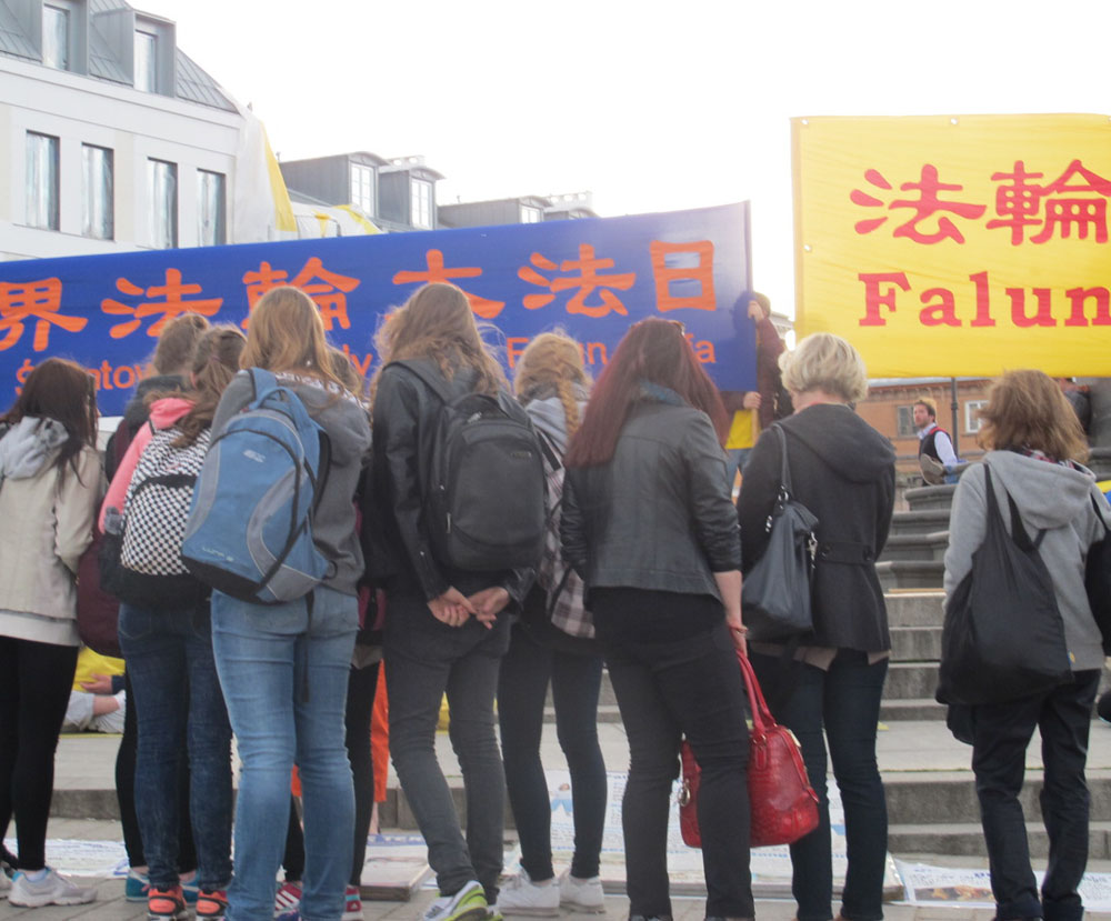 他说:“我国内的表妹一直在炼法轮功,她是一名小学老师,炼功前很多病,炼功后全好了。打压后她还坚持炼和教别人,最后就受迫害进了劳教所。我看着她的坚持很受触动,加上几次出国我看到海外的自由情况,我也就萌发了要学法轮功的想法,今天就买了书,我现在想知道哪里可以上‘九天班’。”