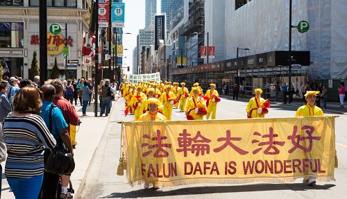 【明慧网二零一五年五月十九日】(明慧记者章韵多伦多报道)二零一五年五月十七日,法轮功学员在加拿大多伦多市政广场以集体炼功、舞台表演等形式,庆祝法轮大法弘传二十三周年,中午一点三十分,开始了盛大的游行活动。游行队伍由天国乐团引导,随后是大法弘传、仙女队、反迫害、酷刑展、退党等方阵,最后是腰鼓队。途经皇后央街及唐人街,再返回弥敦菲腊广场。一路上,游行队伍气势磅礴,吸引沿路的民众驻足观看,许多人拍照、摄影和鼓掌赞赏。