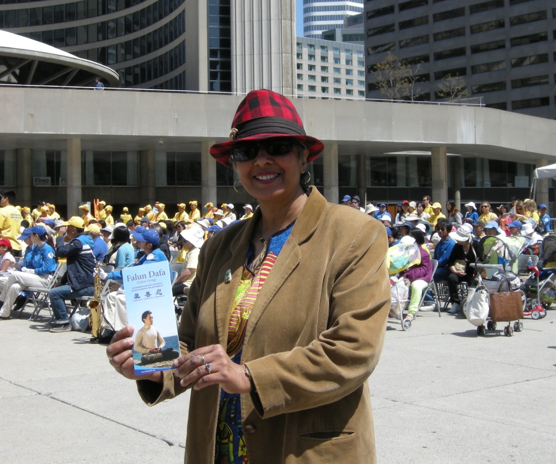 多伦多社区工作者Pam当天来到了庆祝现场,参加了集会和游行,她说,法轮功社区所有的东西都令人印象深刻,“非常和平、非常有爱心、非常非常热情”,“平和是重点”。