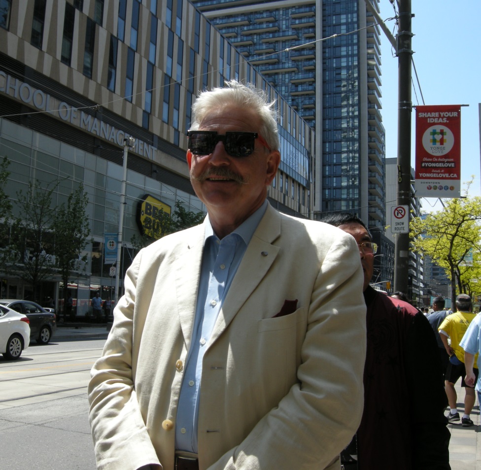 ![]() 安省省议员麦克莱伦(Jack MacLaren)参加了游行,还沿途向路人发放法轮功传单 |