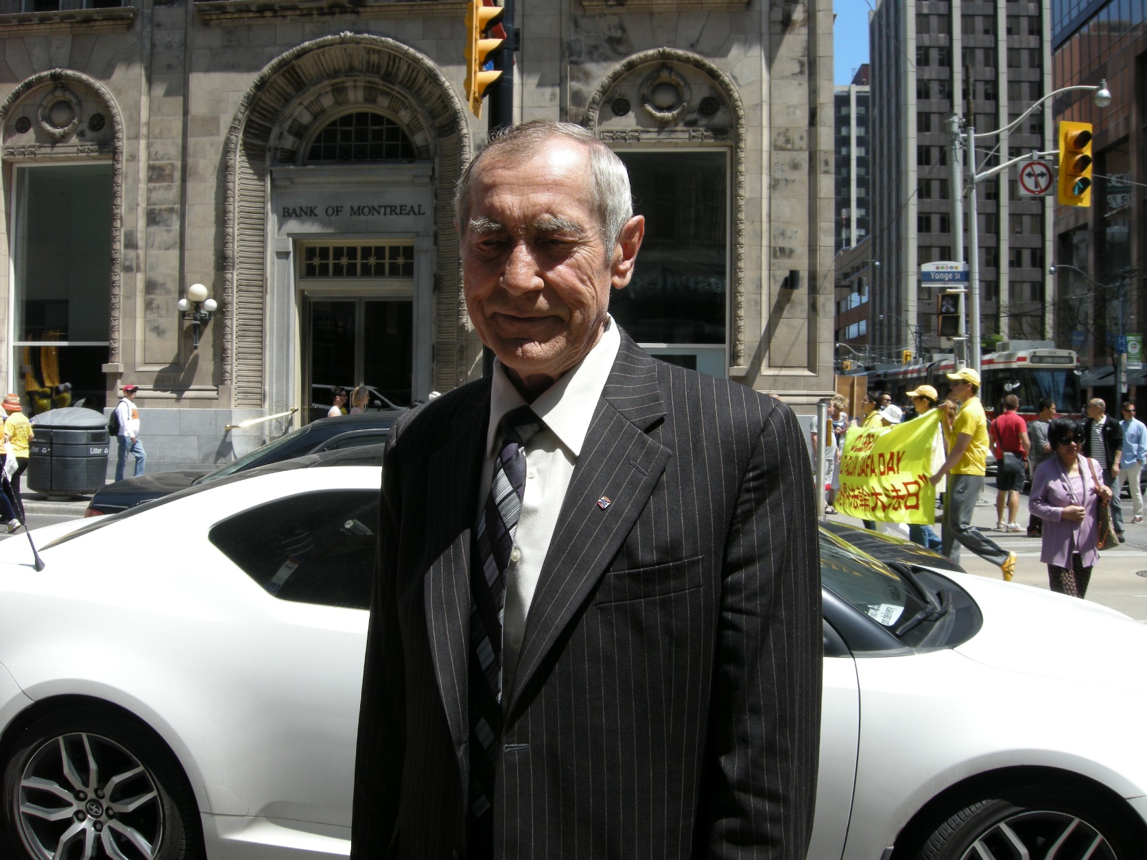 安省省议员麦克莱伦(Jack MacLaren)参加了早晨在多伦多市政广场的集会活动,并在集会上发言。随后,他又参加了下午的游行活动。他手拿“法轮大法好”的横幅走在游行队伍中,还不时地走出队伍,向路人发放法轮功传单,并对路人说:“请支持法轮功。”