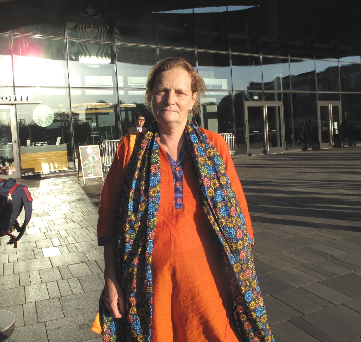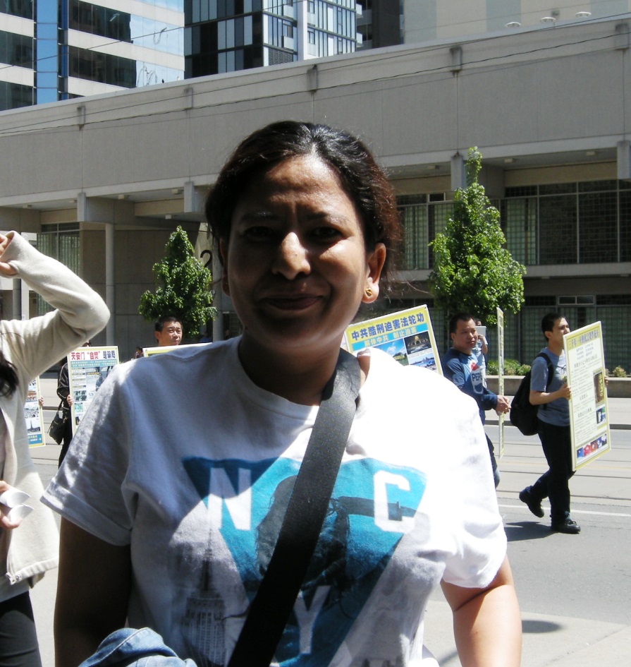 Bindu在市中心的一家公司工作,她拿着传单在认真阅读,她看到揭露酷刑展的车驶过时,不明白什么意思,听完法轮功学员的介绍后,她非常激动地说:“非常感谢今天的游行,让我知道了这些信息,我在香港也看过游行,但不知道真正的内容是什么,今天终于看明白了,我一定会支持法轮功反迫害。”