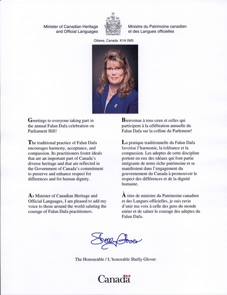 加拿大文化承传及官方语言部长雪莉•格洛弗(Shelly Glover)在贺信中向在加拿大国会山庆祝法轮大法洪传二十三周年的所有人问好。