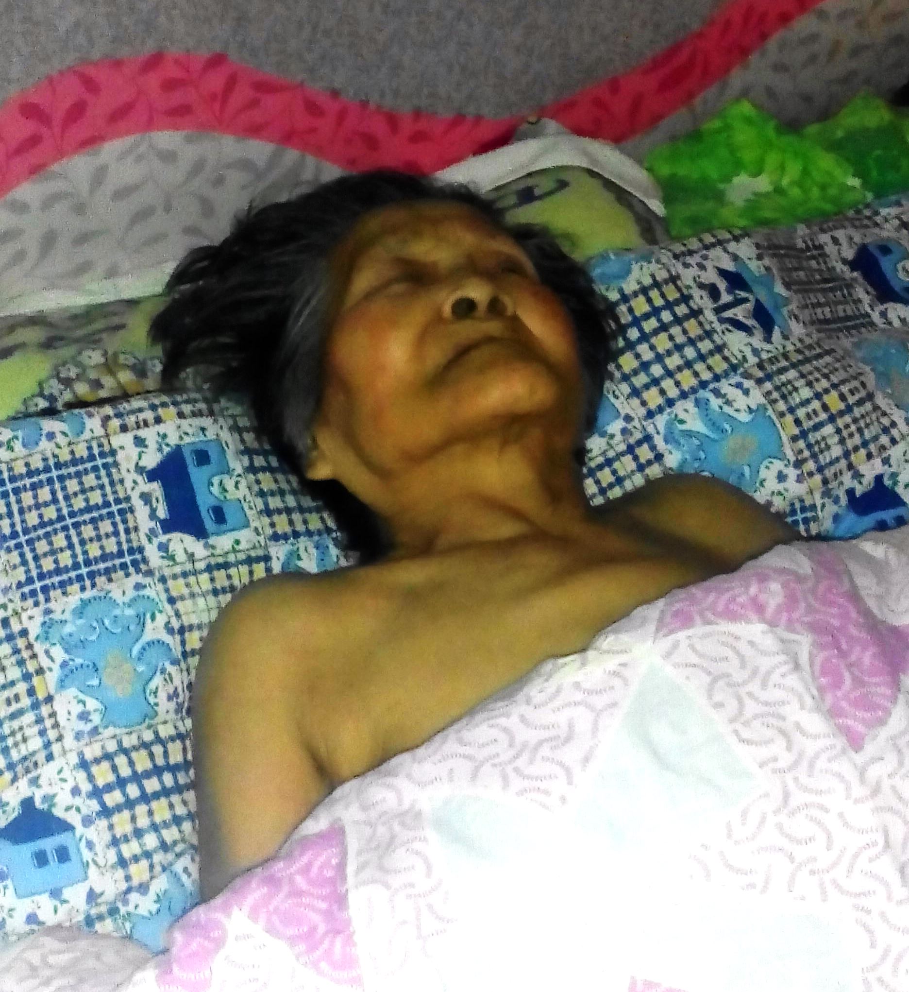 这位八十七岁的老母亲自从二零一四年亲眼目睹女儿李建美在家中被中共警察绑架后受到强烈的刺激,从那以后意识更不清了,甚至连坐也坐不起来了,每天只能躺着。