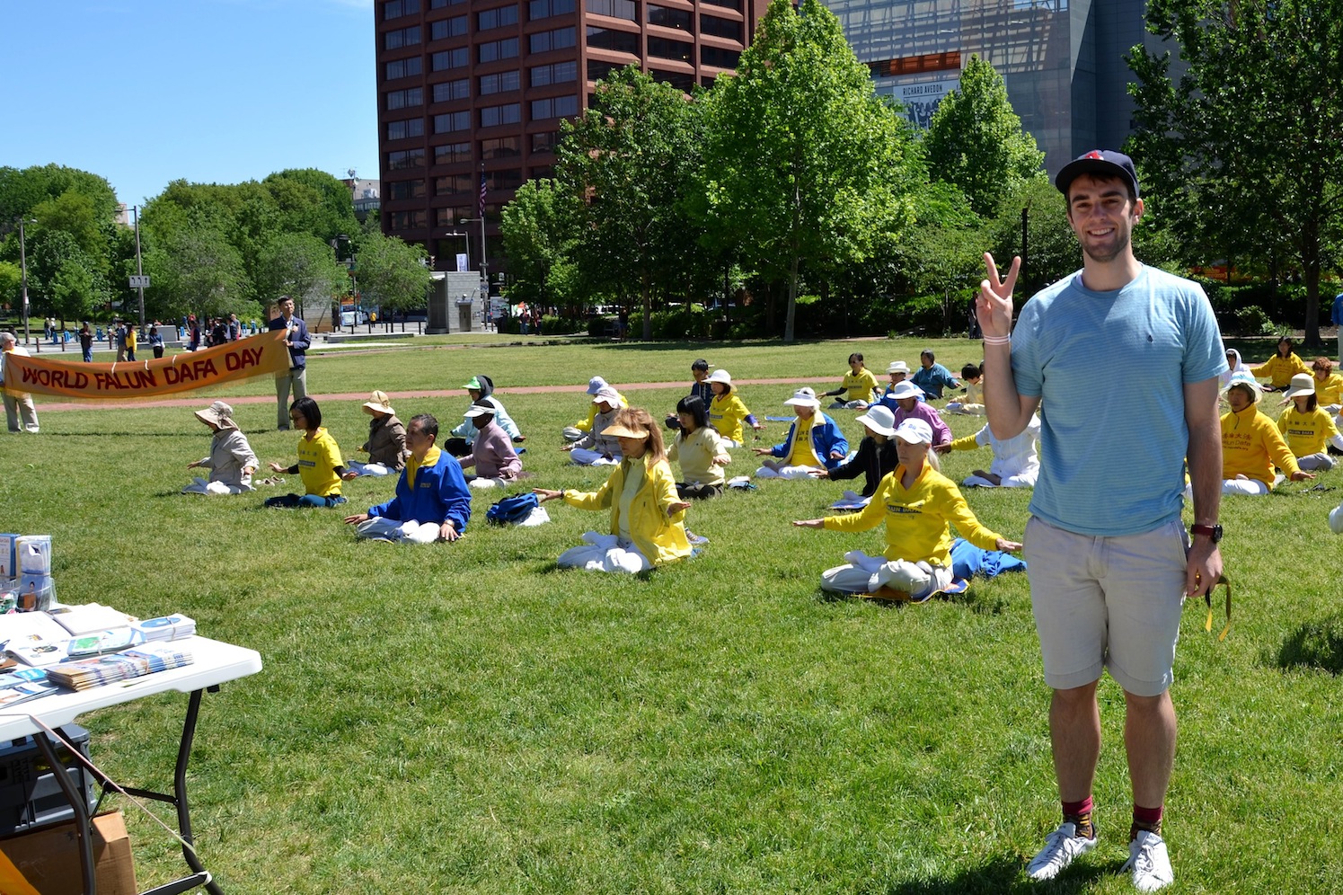 当天,来自美国首都华盛顿的杰里德(Jered)先生参观自由钟时被法轮功学员们盛大的活动场面所吸引。他主动索要法轮功真相资料后,以流利的中文告诉学员说,他在大学时学的专业是国际关系,现在华盛顿的一家联邦政府机构工作,以前曾在台湾学习了两年中文,对中国文化很感兴趣,自己还有一个中文名字叫“柯博文”。他还说,在大学的课堂上曾经接触过法轮功的内容,知道中共对法轮功的残酷迫害。今天看到这么多的法轮功学员平静祥和地展示功法,很感慨。他说支持法轮功学员的反迫害,中共对信仰自由的践踏是不能接受的。