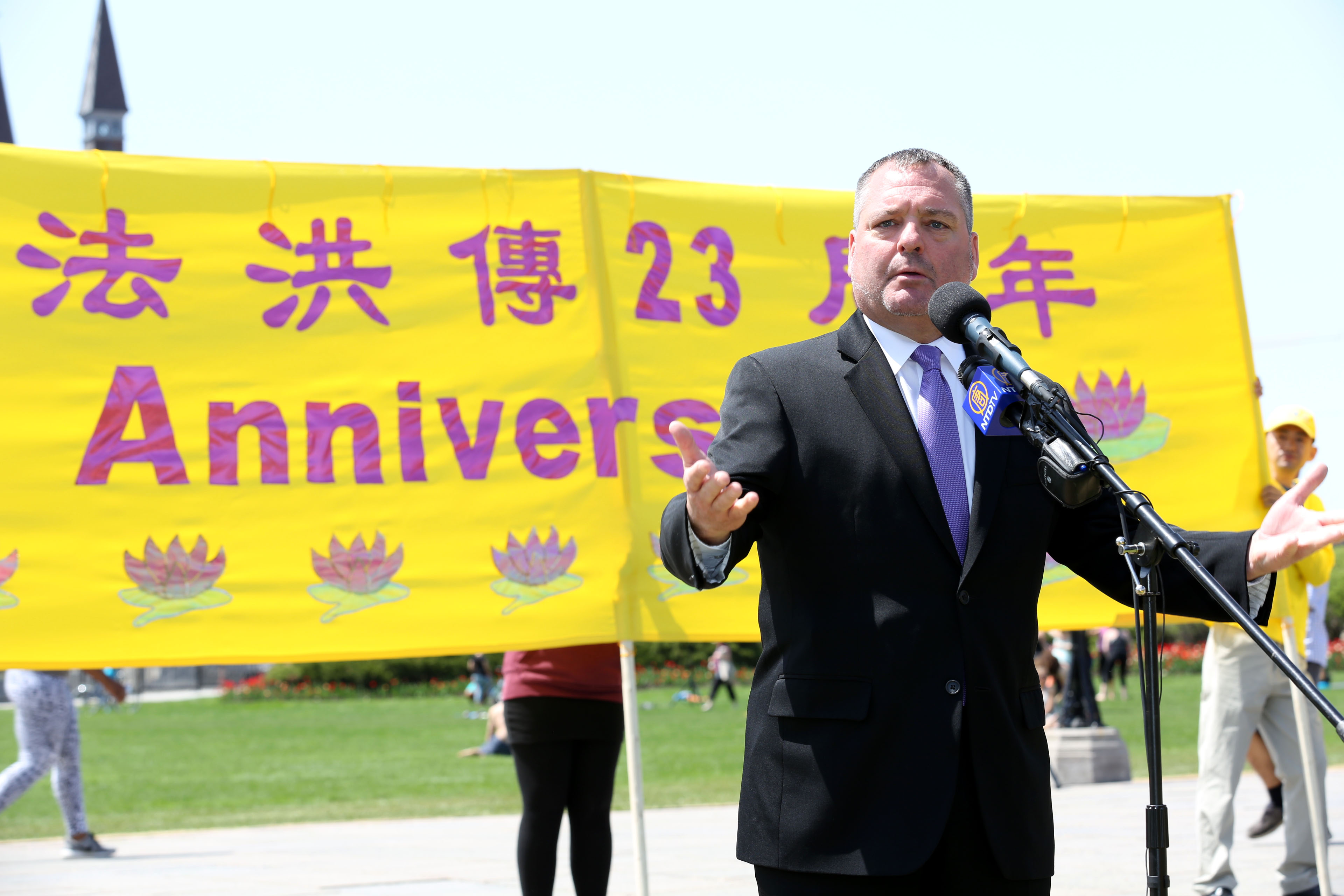 “你们主要的目的除了在这里(庆祝),我认为重要的是你们知道在生活中遵循你们的精神信仰,你正在尽最大努力让人们(对法轮功)的意识提高到另一个层次。你们的抗争不仅仅是为法轮大法,不仅仅为你的兄弟和姐妹,它是普世的抗争……感谢你们的努力、你们的承诺,和你们的坚持。”