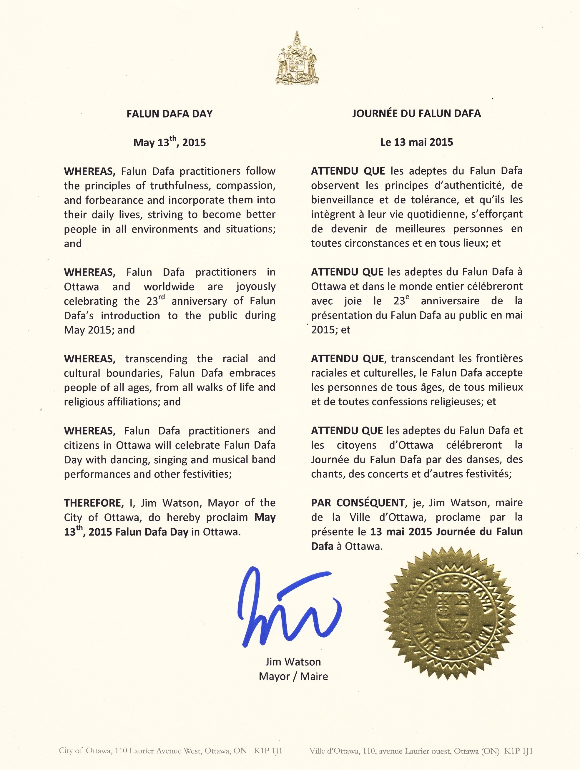 因此,我,吉姆•沃森,渥太华的市长,宣布二零一五年五月十三日为“渥太华法轮大法日”。