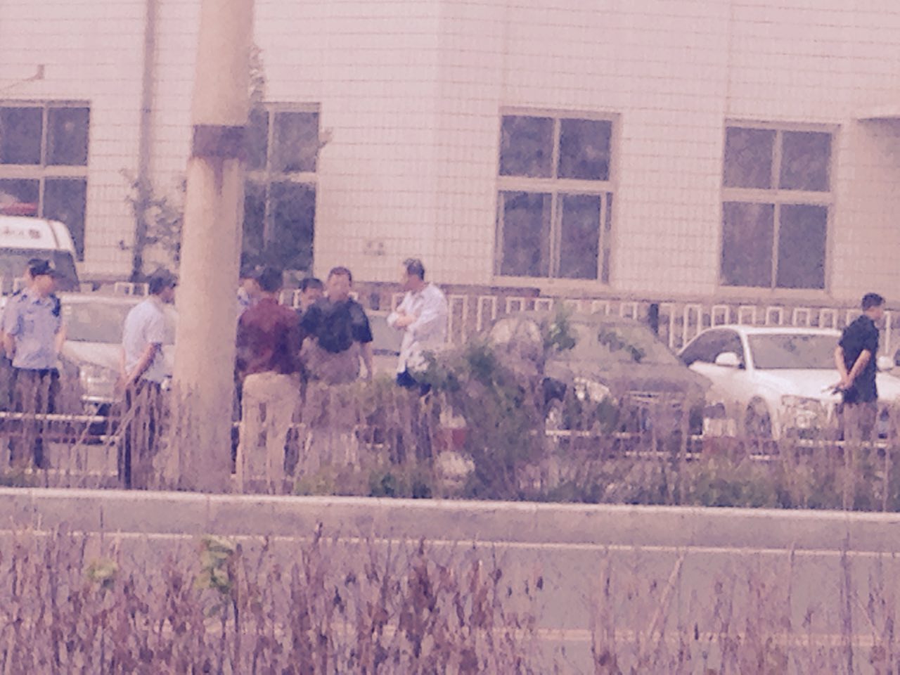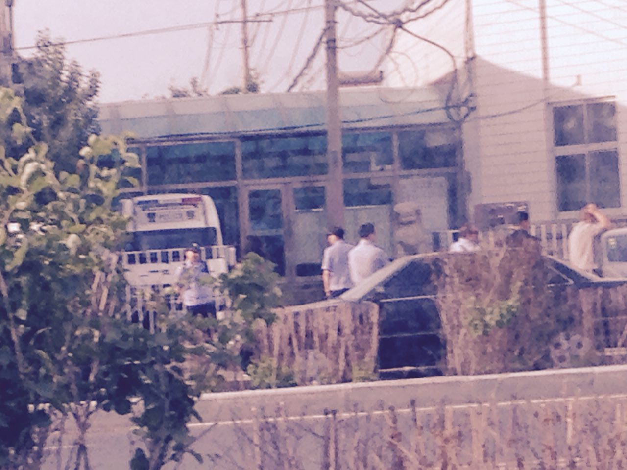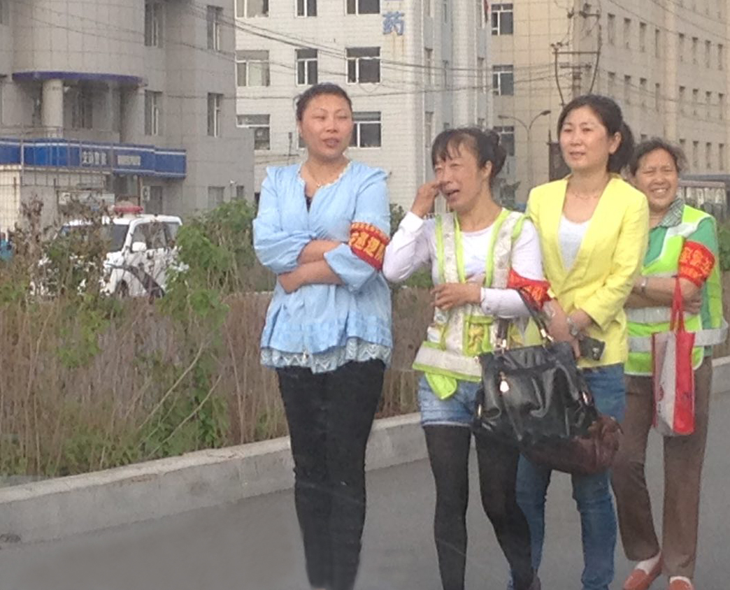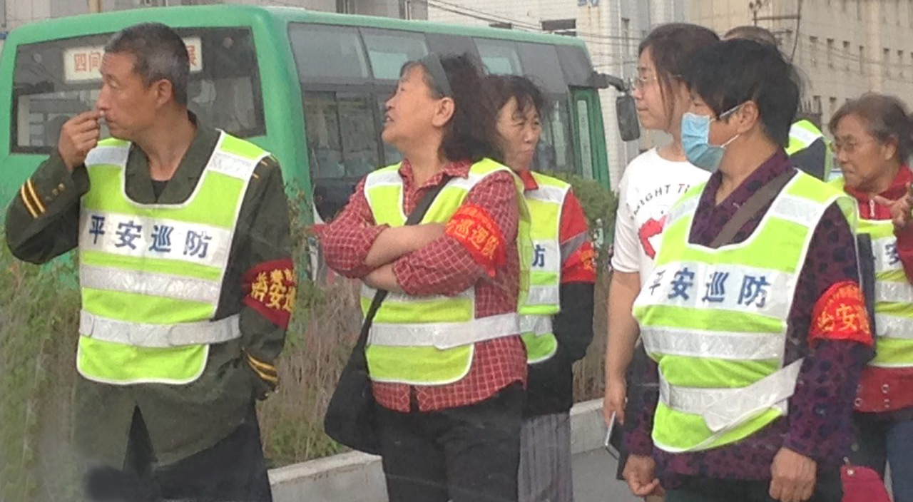 王淑艳和刘香阁两家家属起大早赶到法院,发现五点之前,法院门前道路就已全封闭了,两辆警车横在法院门口,众多像私家车的便衣车占据着路旁,门口除了着警服的警察外,到处都是便衣,他们上身着各色西服,下穿警裤,拿着小铲子,在铲道路两旁贴在电线杆和建筑物上揭露宽城区法院非法开庭的真相传单。
