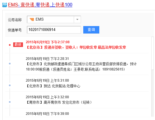 二零一五年六月十七日,吉林市北华大学师范分院教师魏修娟,把起诉和控告江泽民的诉状用邮政特快专递(EMS)分别寄给了最高法院和最高检察院,在网上查询已经被两高签收。