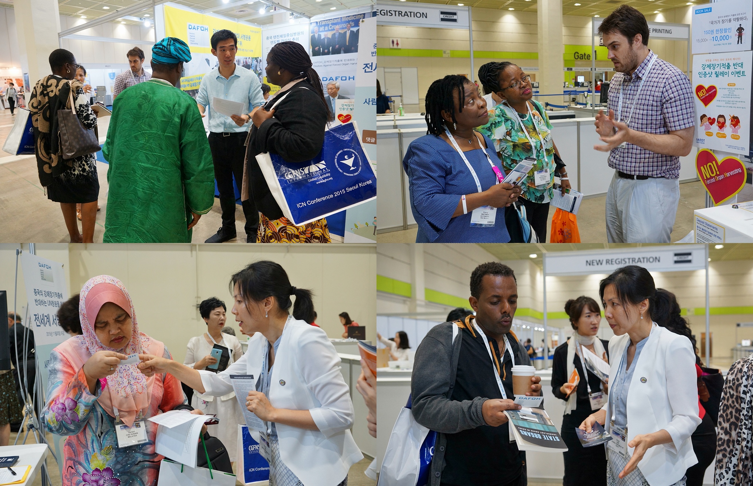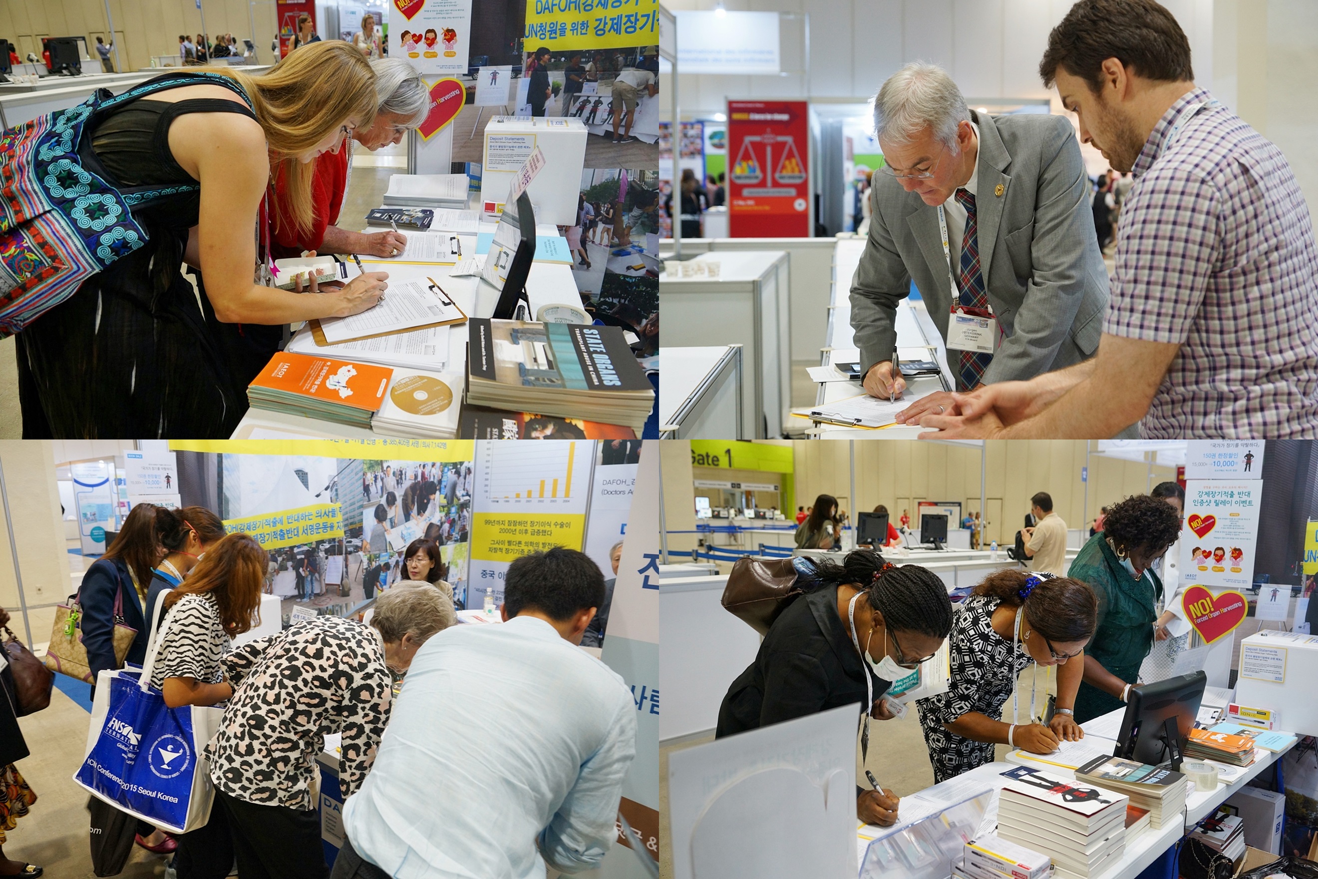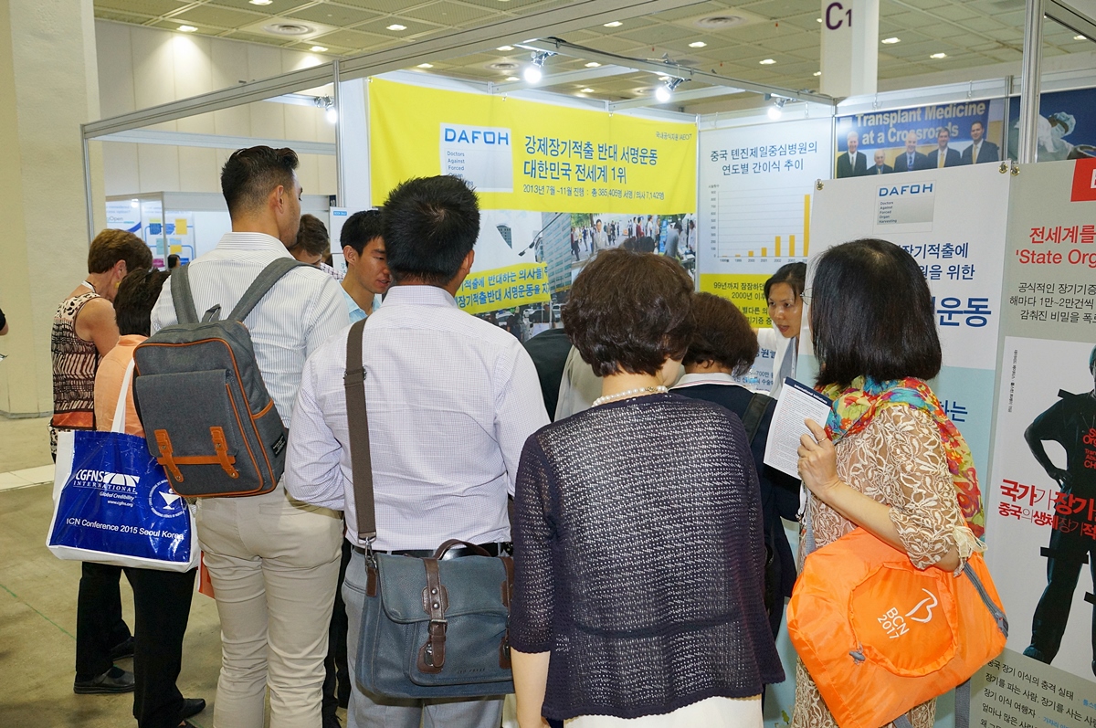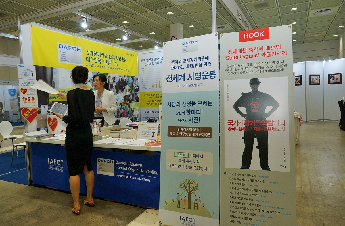 大会期间,韩国非政府组织“国际脏器伦理协会”(IAEOT)与反对强摘器官的国际医师团体“DAFOH”来此共同设立展位,曝光中共活摘法轮功学员器官的暴行,并征集签名呼吁联合国制止中共强摘法轮功学员器官的罪行。