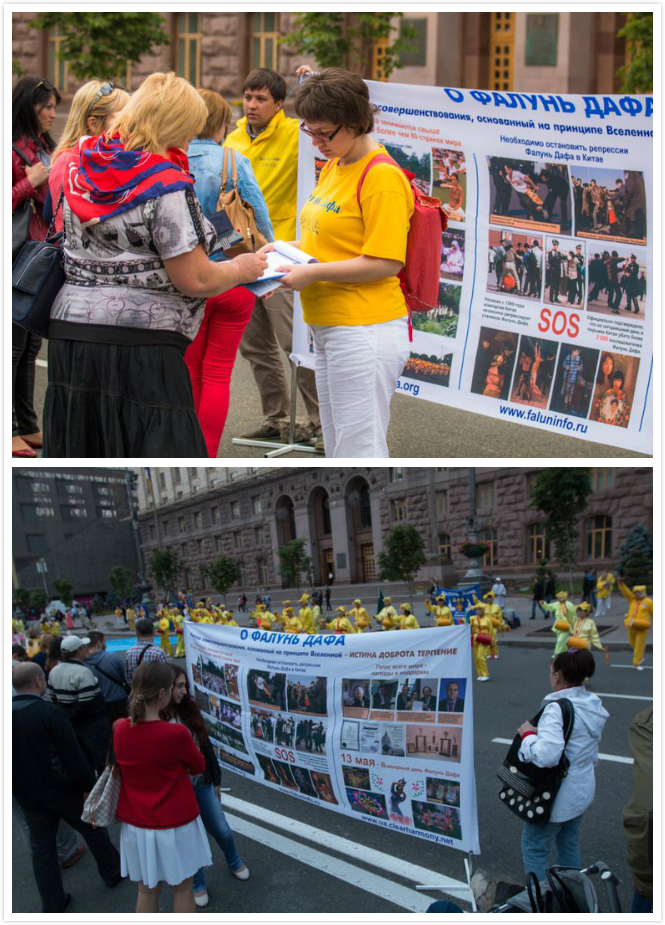 【明慧网二零一五年六月四日】二零一五年五月二十九日至三十一日,来自乌克兰、俄罗斯、白俄罗斯、加拿大、荷兰的法轮功学员们参加了乌克兰法会。在为期三天的法会中,法轮功学员们还在中使馆前举行和平抗议;在基辅市中心最繁华的步行大道弘法讲真相,演示功法,并表演舞蹈、舞龙和腰鼓;最后法会上,学员们分享修炼升华后的喜悦和美好。