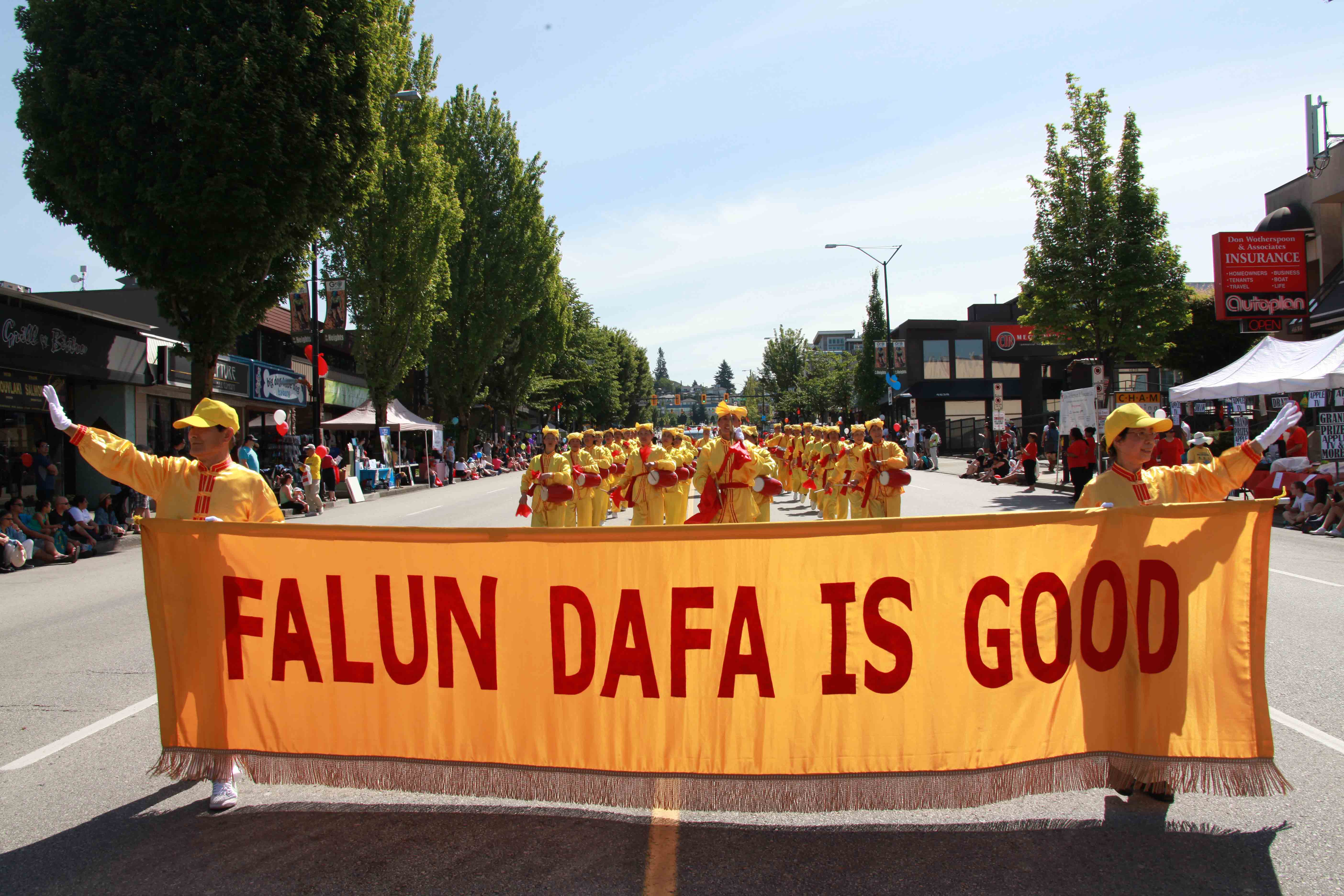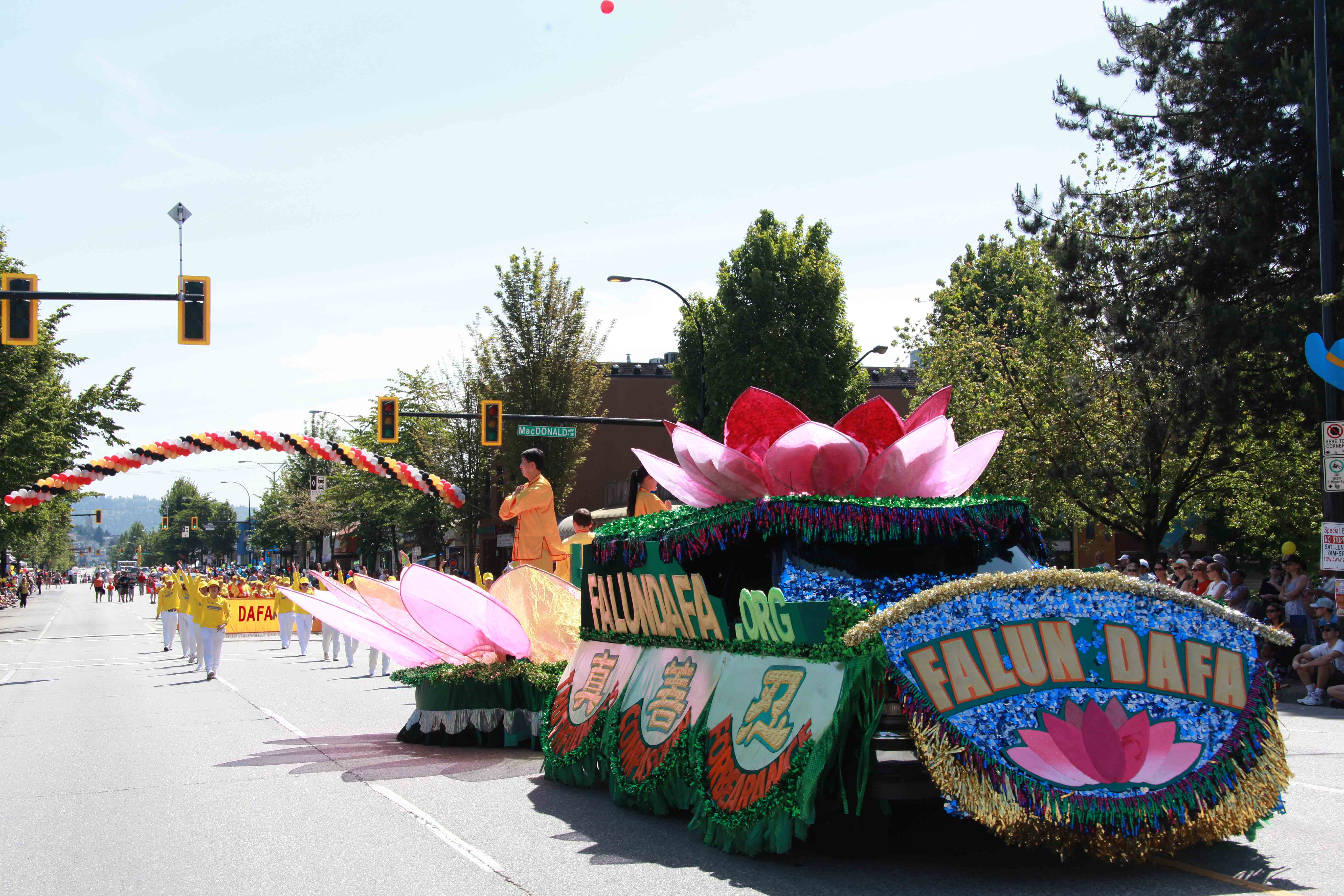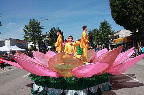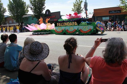 法轮功学员的游行队伍包括天国乐团、“真善忍”花车、腰鼓队、法轮功功法演示队。一路走来,受到沿途民众热烈欢迎。本拿比有大批华人居住,很多华人拍摄法轮功学员的游行队伍。还有华人赞叹“真好看哪”,“法轮大法好,法轮大法好,你看见了吗?”
