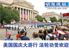 美国国庆大游行 法轮功学员受欢迎