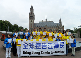 部分目前生活在荷兰,曾经在中国大陆被中共迫害的法轮功学员,来到海牙国际法庭门前,举办控告江泽民迫害法轮功的集会活动,同时,声援中国大陆控告江泽民的大潮。