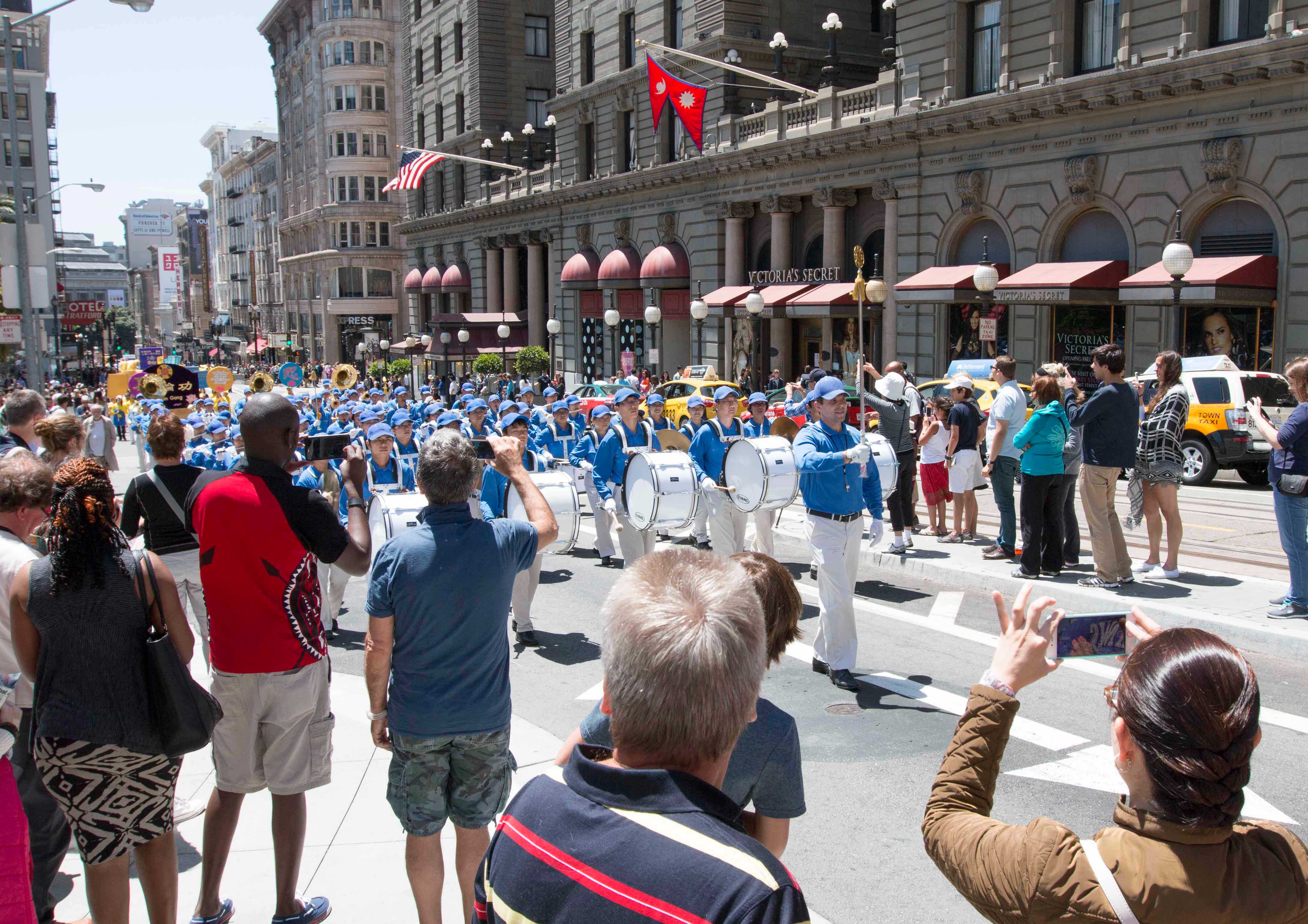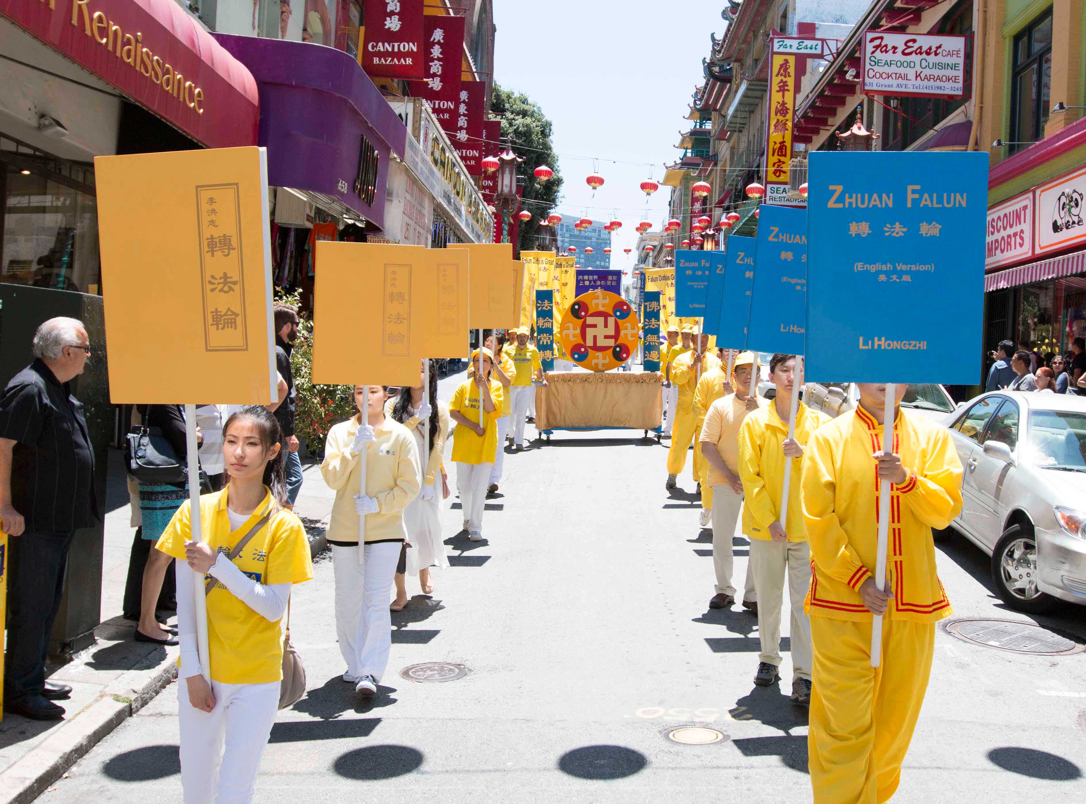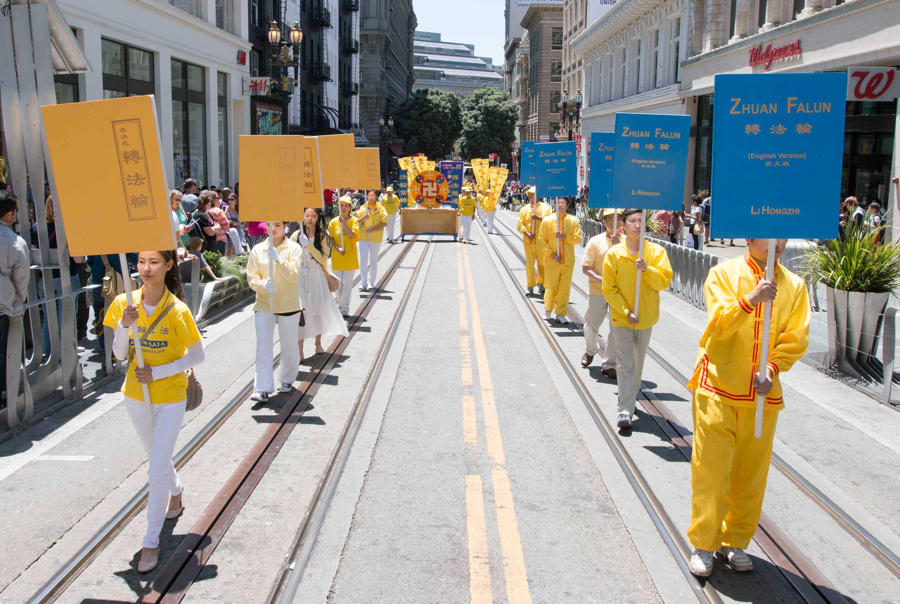 旧金山法轮功学员的游行队伍于中午十二点开始从位于市政厅附近的联合国广场出发,浩浩荡荡的游行队伍,在声势浩大的美西天国乐团的引领下沿着市场街经过主要市区,再环绕中国城,最后抵达中国城花园角广场举行集会。