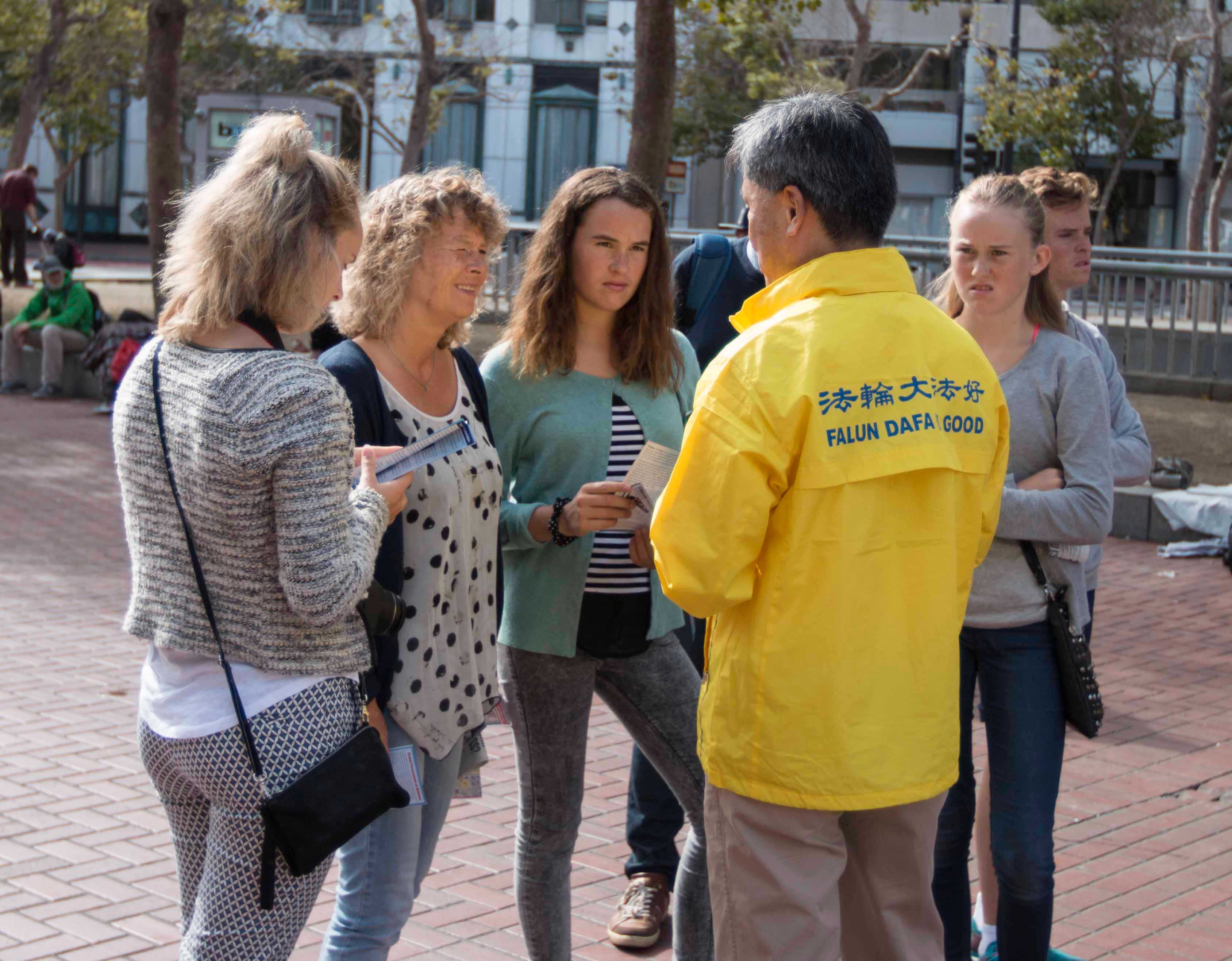 在中国城,一位华人女士来到法轮功学员前索要真相传单要了解更多真相。她气愤的说怎么能从活人那摘取器官这种行为禽兽不如。当她听说江被起诉她说我很高兴听到这个消息。我为我们一家能逃离共产党的魔掌而感到幸运。
