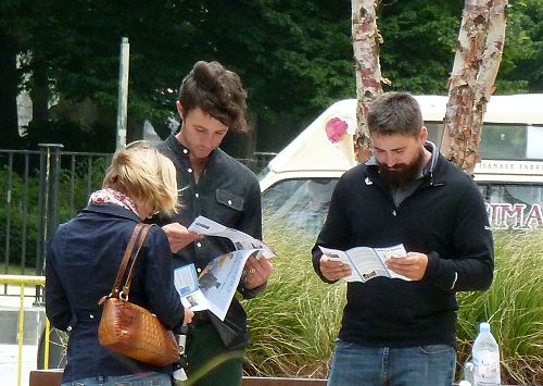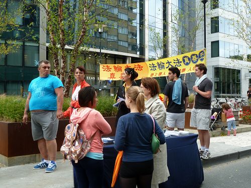 当天,有许多过往行人经过活动现场,接受了真相传单,不少人驻足了解迫害真相,包括为峰会维护秩序的警察。一名警察官员询问他的同事法轮功是什么。他们接过法轮功学员递上的真相小册子后,仔细阅读后又传给了其他同事。其中一名警察来到学员面前说:对他们来说,法轮功学员是一个很好的团体,合作起来总是很愉快。