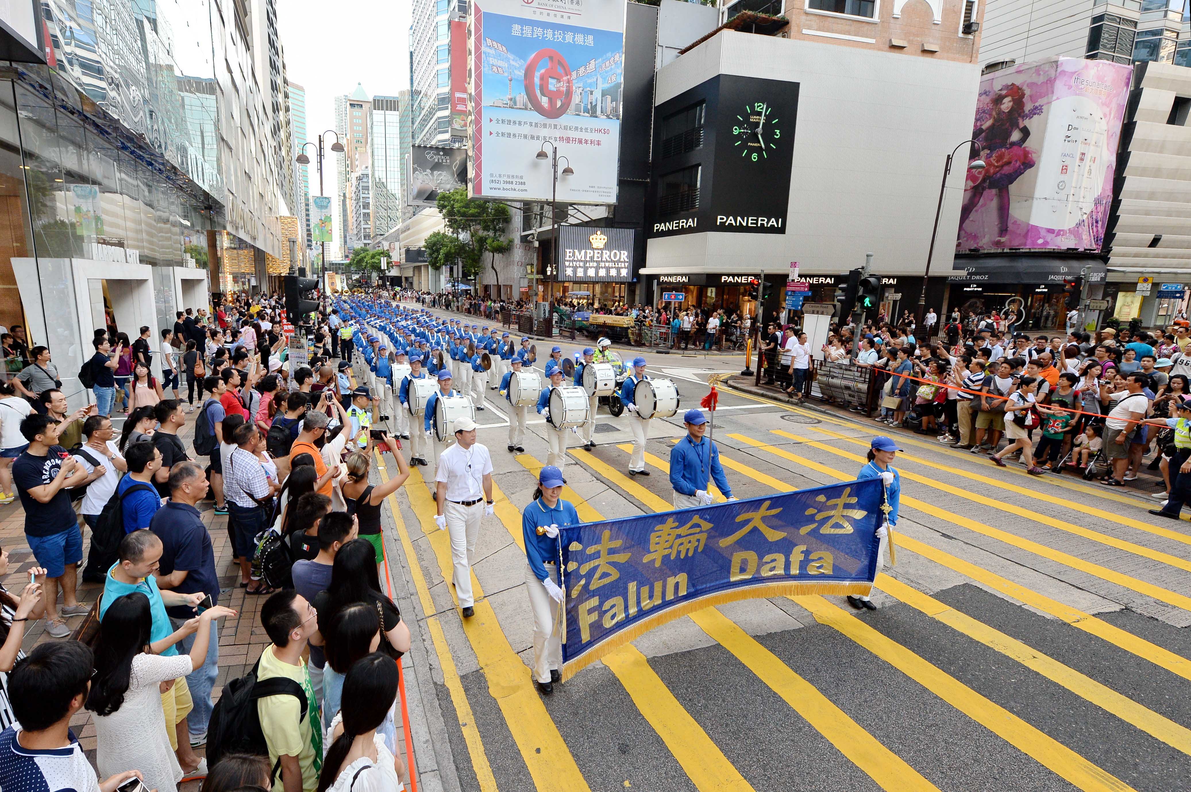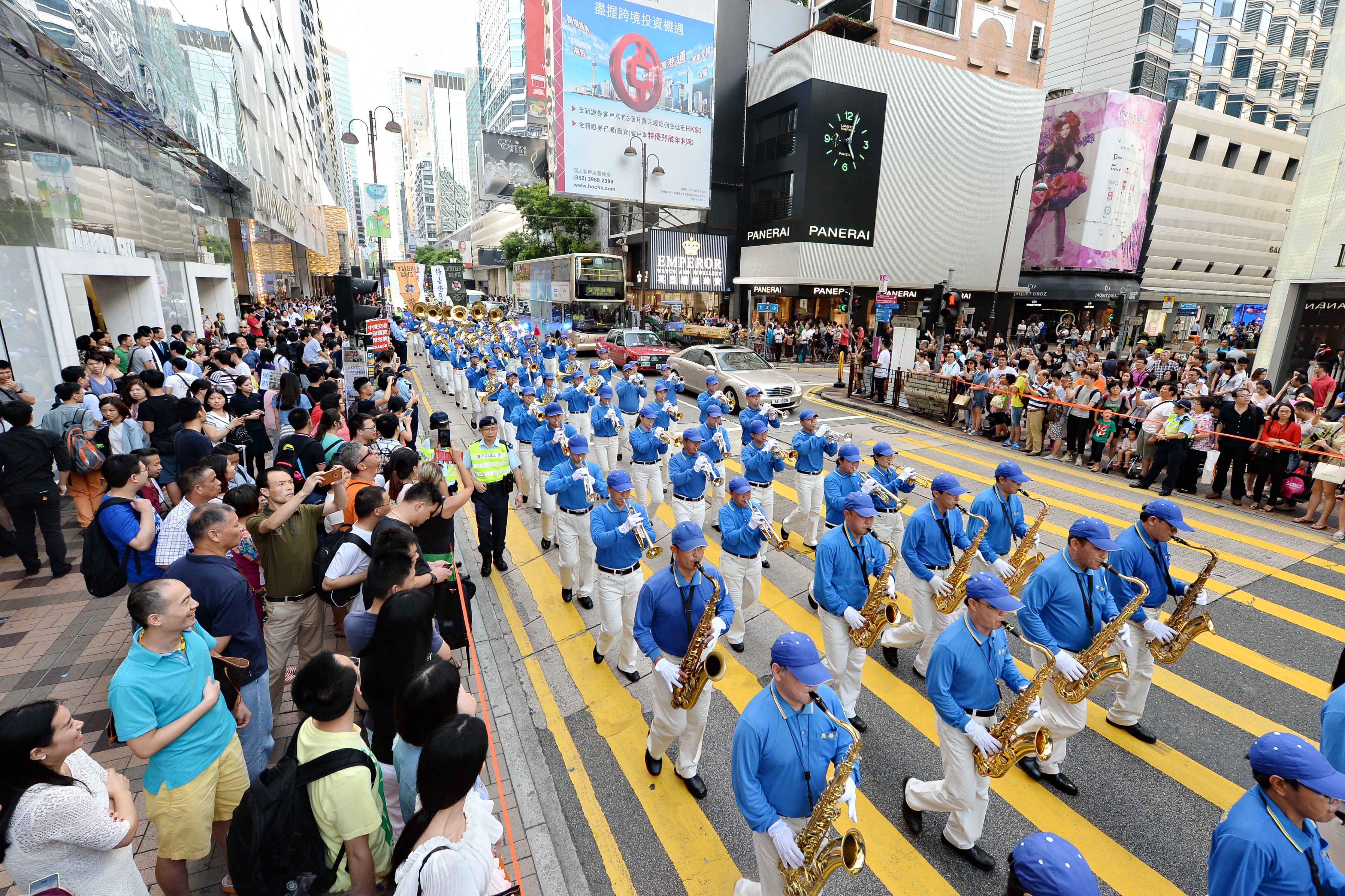 ![]() 图1:由法轮功学员组成的天国乐团引领法轮功学员的队伍,游行九龙区旺角、佐敦,再到尖沙咀广东道,抵达终点天星码头。沿途吸引港民及中西旅客观看。 |