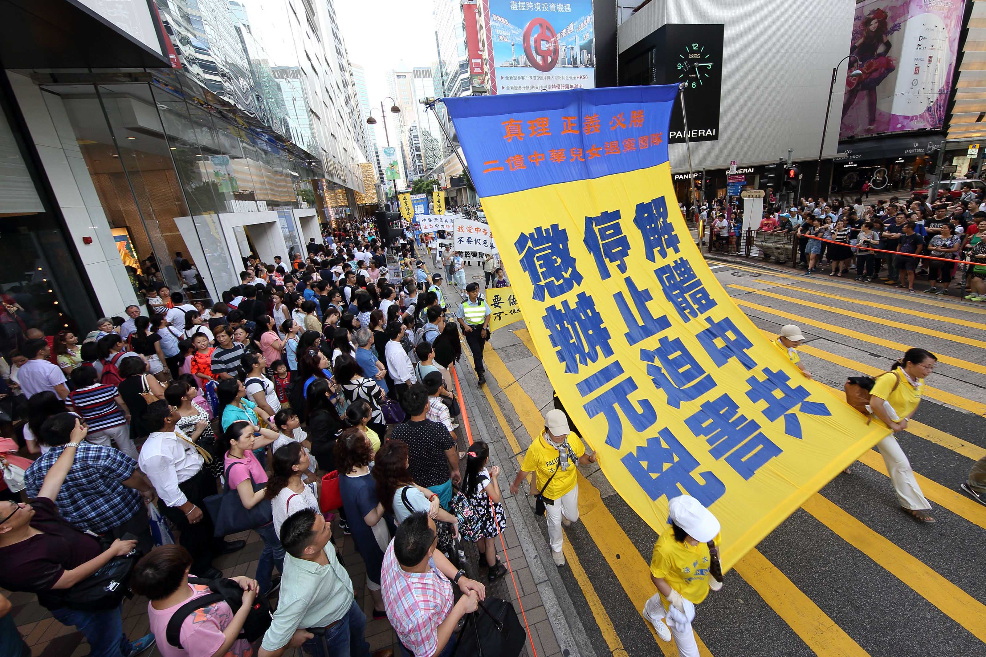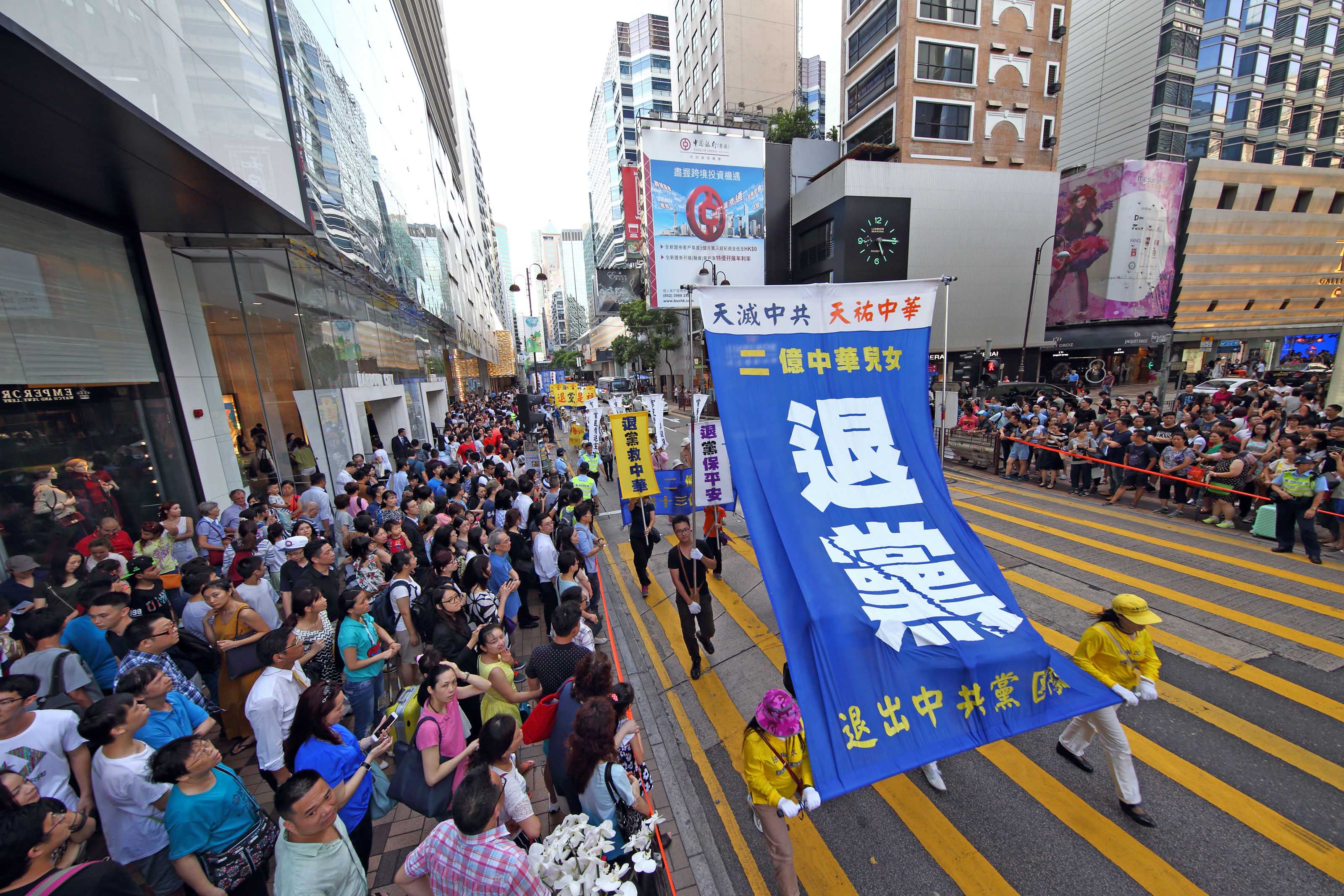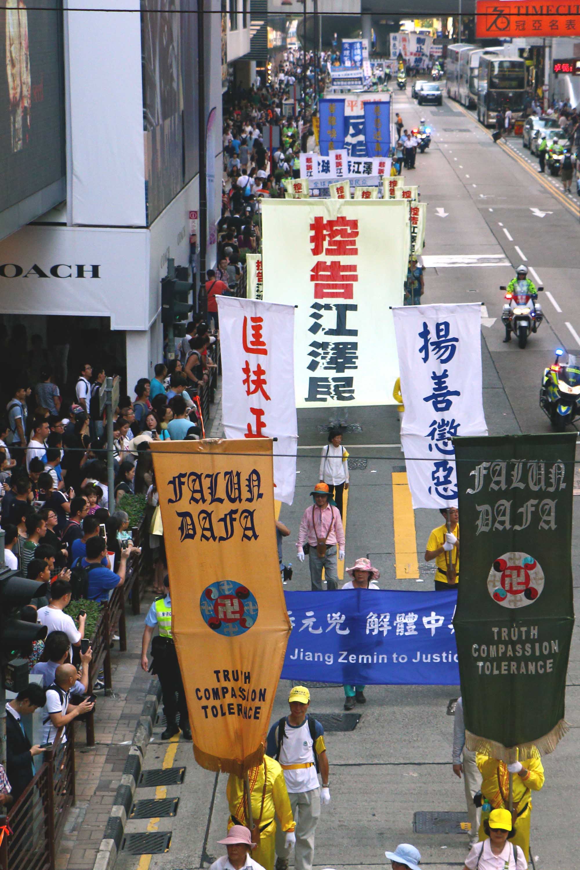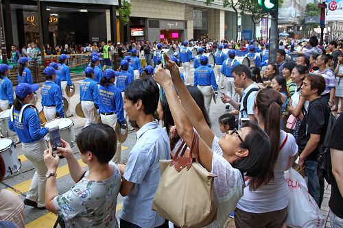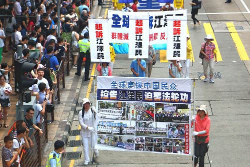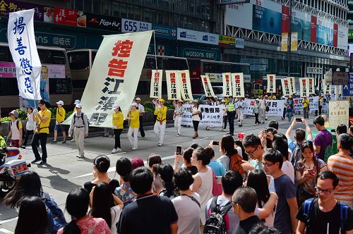 十八日下午二时,法轮功学员的游行队伍在天国乐团演奏“法轮大法好”等多首乐曲的领阵下,由九龙长沙湾游乐场出发,途经九龙区旺角、佐敦,再到尖沙咀广东道,抵达终点天星码头。“法轮大法好”、“世界需要真善忍”、“真相彰显 善恶分明”、“退党救中华”、“控告江泽民”、“法办元凶”、“扬正气 祛妖狼”等旗阵鲜明。震撼许多民众、特别是大陆游客纷纷拿相机、手机或小型录像机拍摄,将这难得的一幕带回去与亲友分享。更有不少人把握这千载难逢的机会声明三退(退出中共党、团、队),获得美好未来的新生契机。