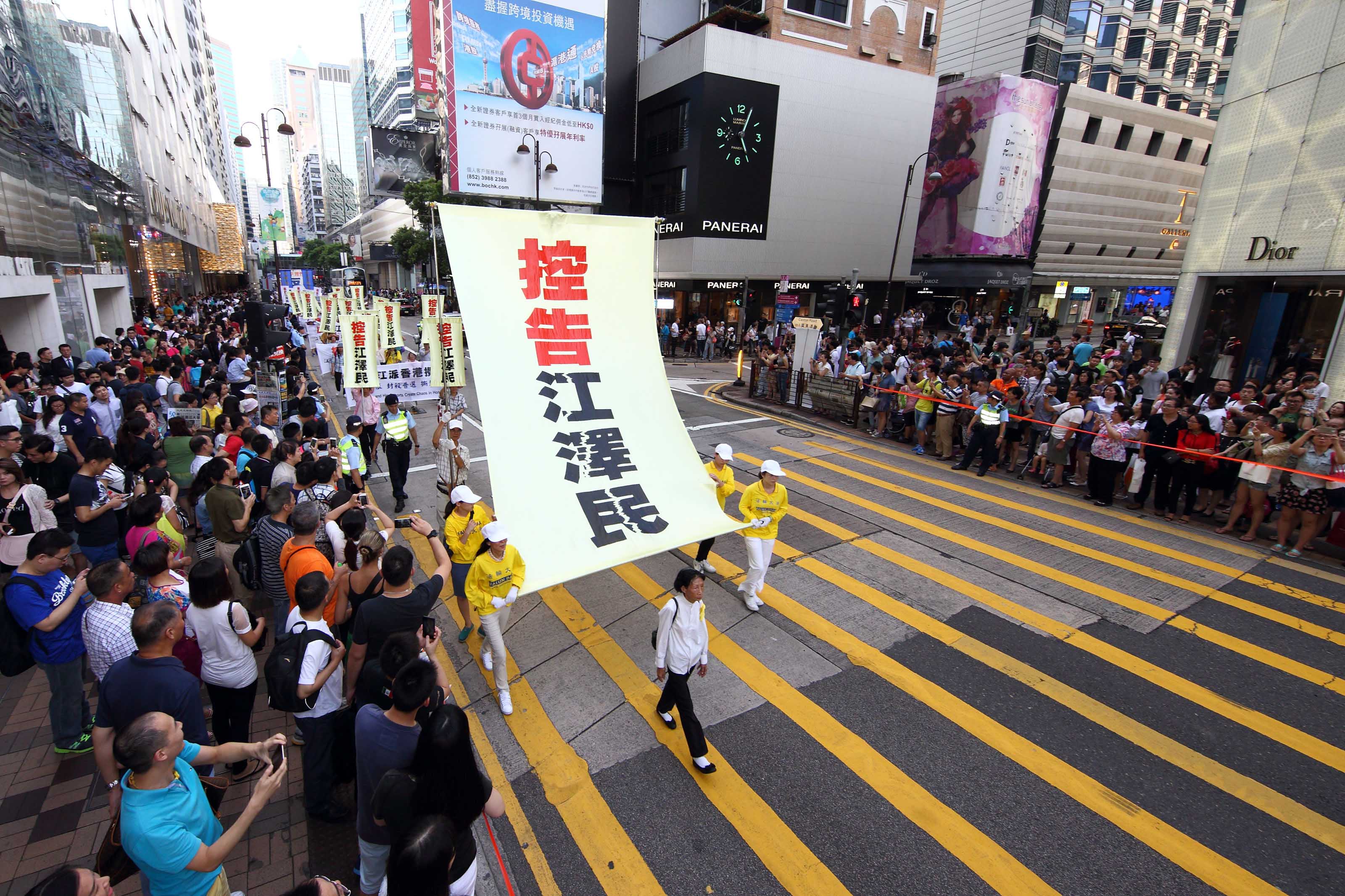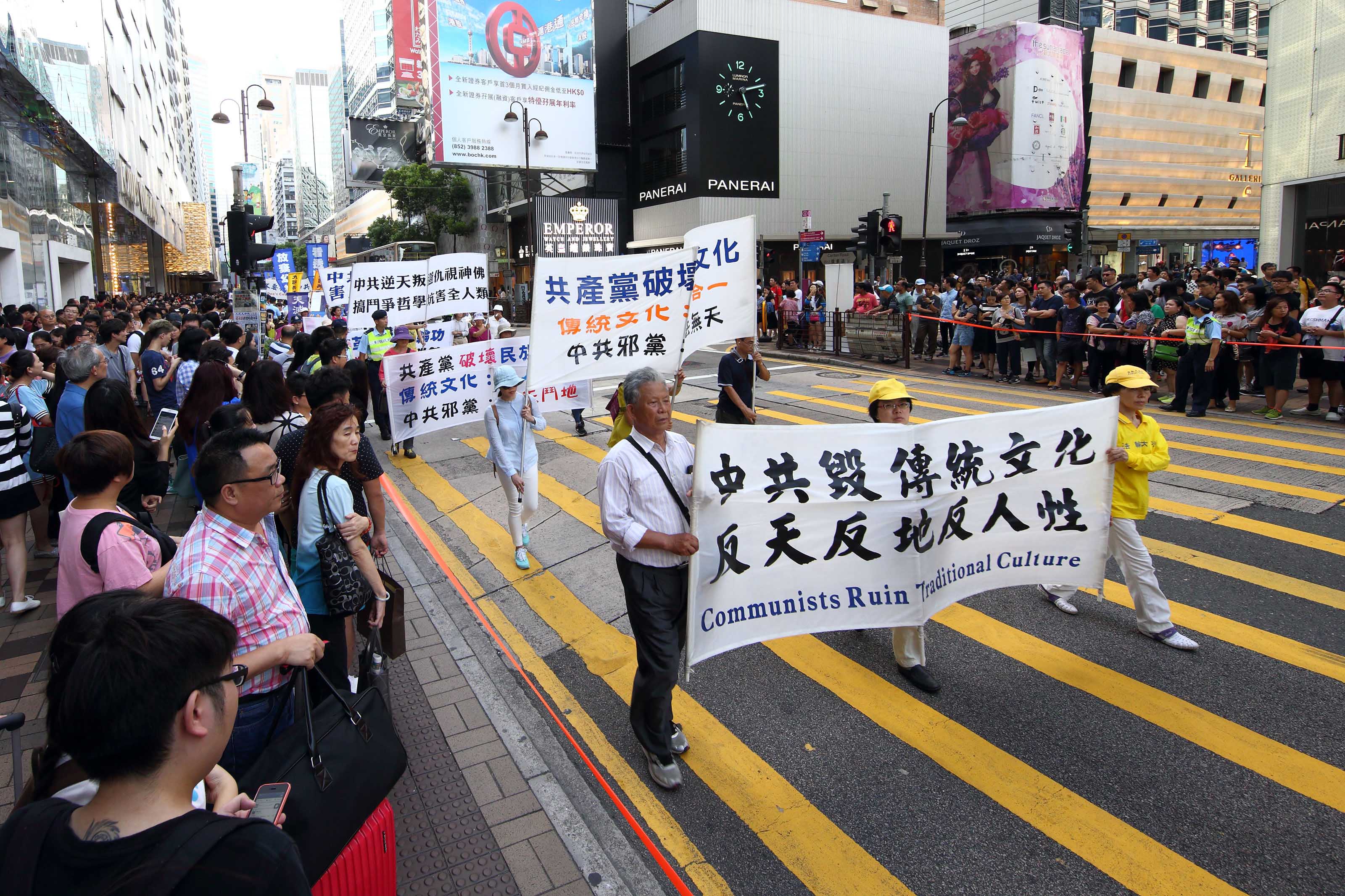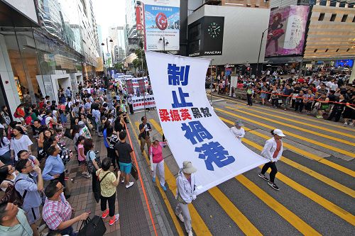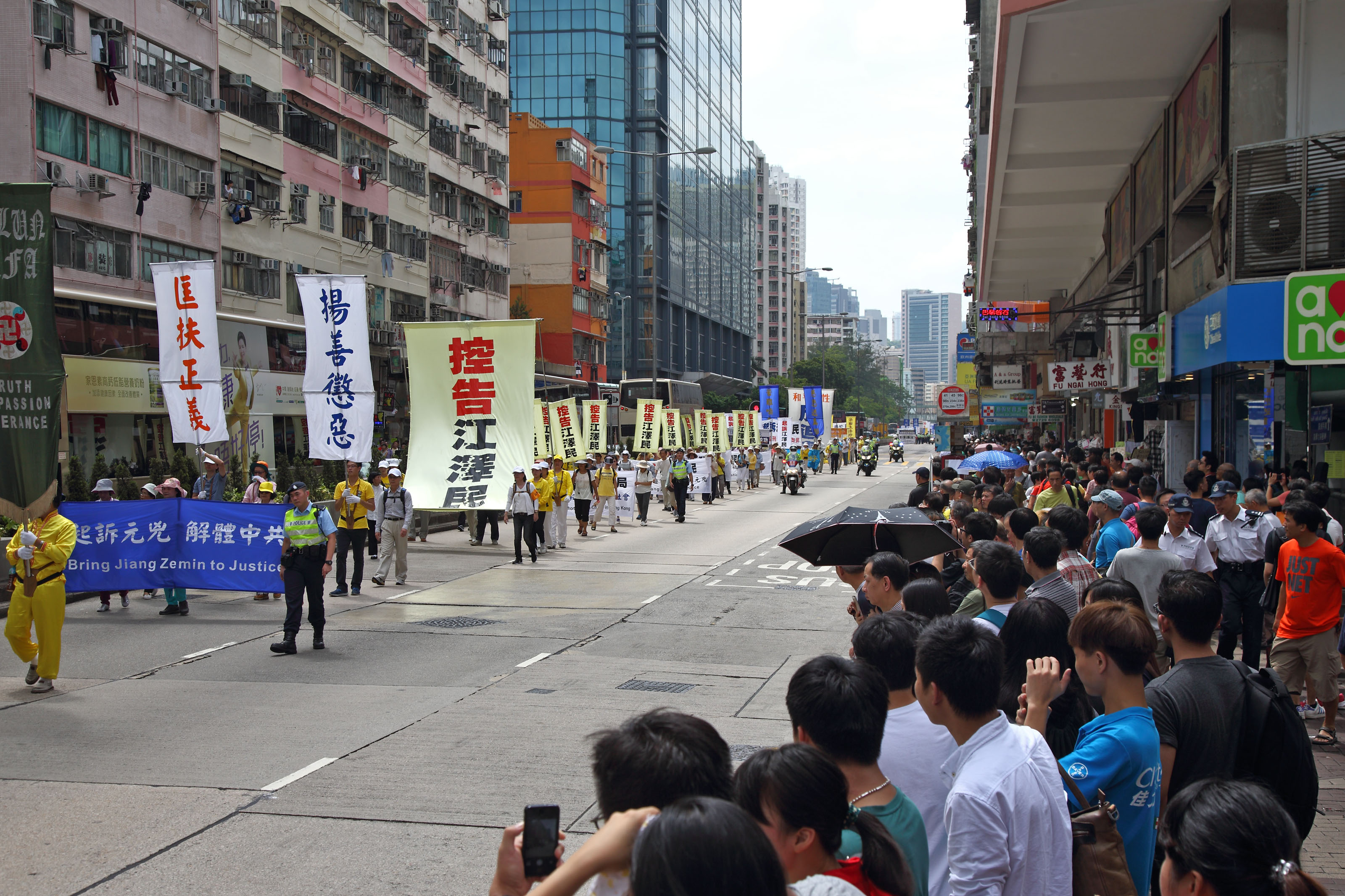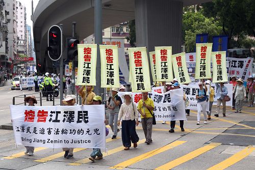 十八日下午二时,法轮功学员的游行队伍在天国乐团演奏“法轮大法好”等多首乐曲的领阵下,由九龙长沙湾游乐场出发,途经九龙区旺角、佐敦,再到尖沙咀广东道,抵达终点天星码头。“法轮大法好”、“世界需要真善忍”、“真相彰显 善恶分明”、“退党救中华”、“控告江泽民”、“法办元凶”、“扬正气 祛妖狼”等旗阵鲜明。震撼许多民众、特别是大陆游客纷纷拿相机、手机或小型录像机拍摄,将这难得的一幕带回去与亲友分享。更有不少人把握这千载难逢的机会声明三退(退出中共党、团、队),获得美好未来的新生契机。