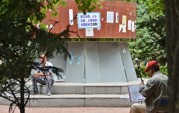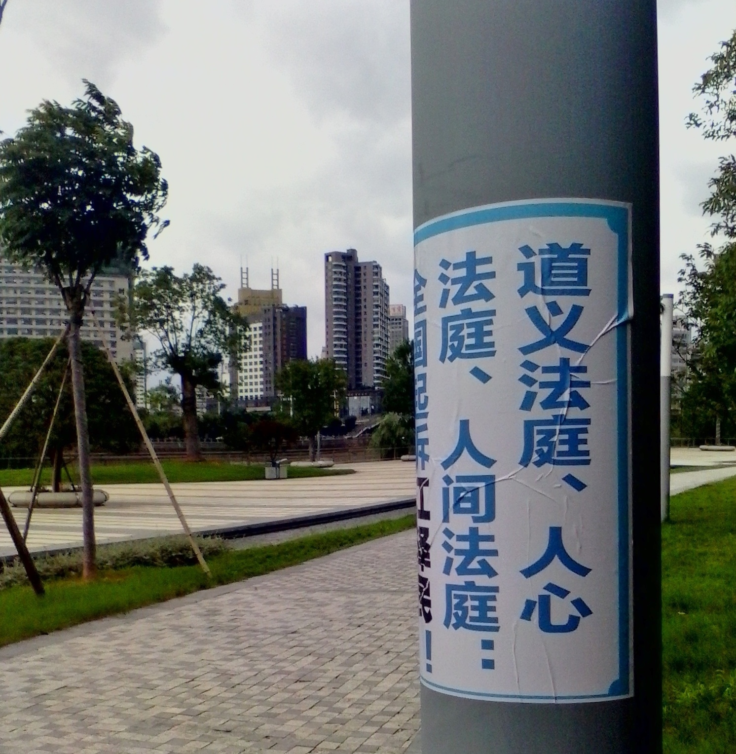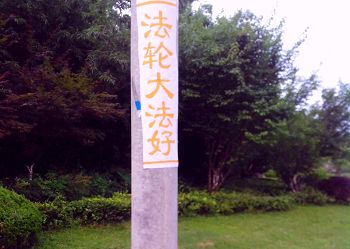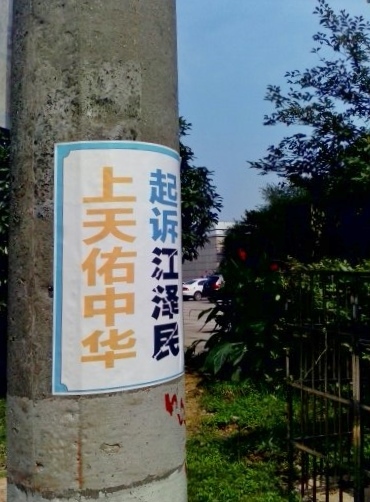七月初,陕西某市街头、公园等处,出现审江真相标语,告诉人们“法轮大法好”和“全国起诉江泽民”的消息。