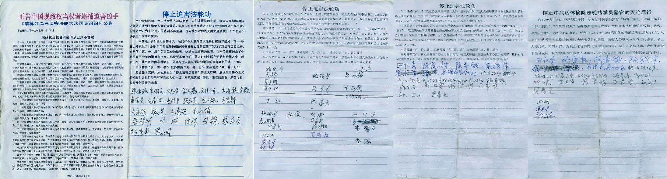 二零零一年五月有一天学校派出所的薛姓副所长到我家里来看,发现家里到处是大法的传单和横幅等真相材料,就把我带到派出所,学校保卫处王哲问我这些真相资料的来源,看我不说就让我先回去好好考虑一下,为了避免他们以后的骚扰,我被迫暂时离开家和其他流离失所的大法弟子住在一起。