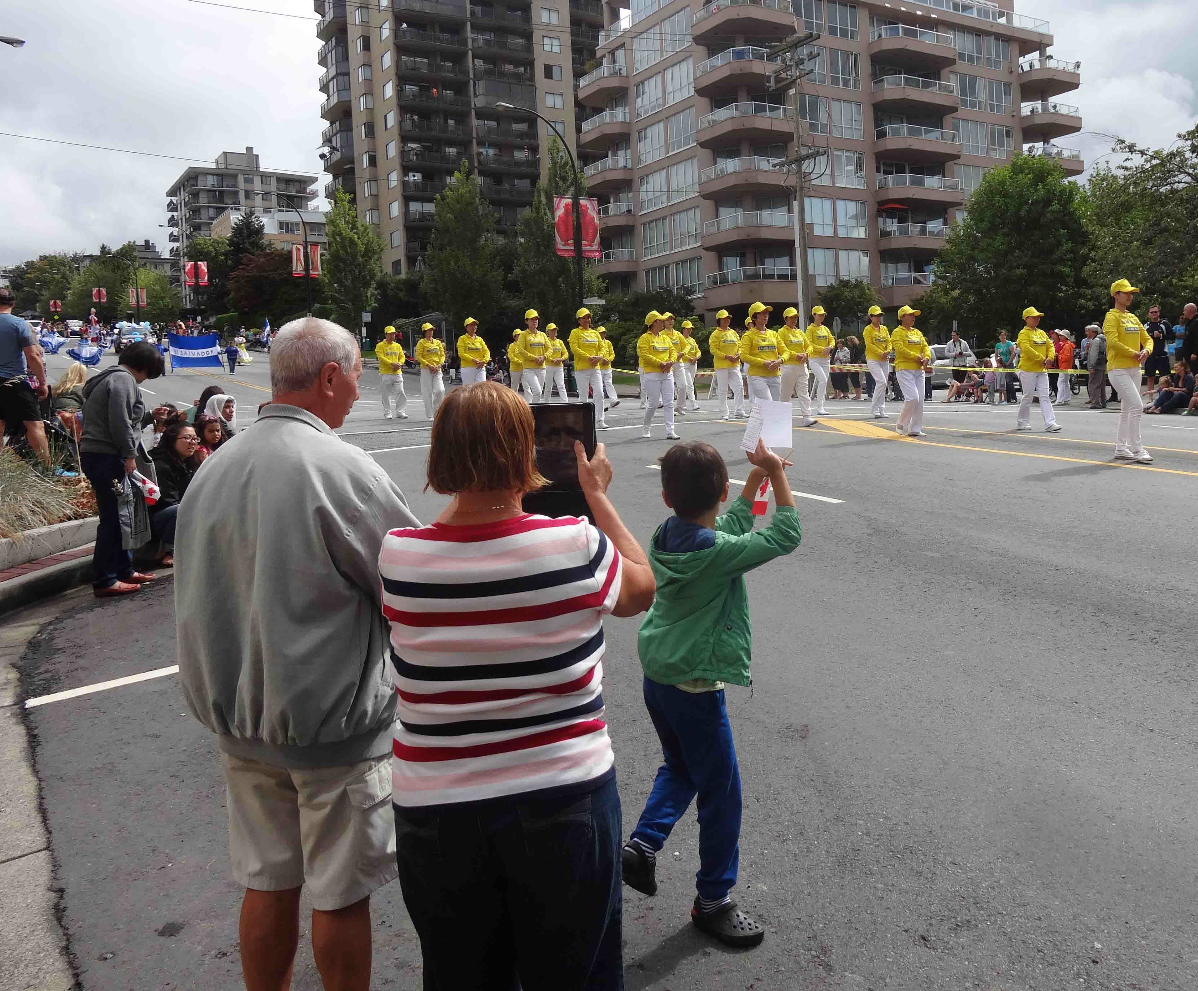 刘先生在中国大陆一所大学里教书,来温哥华探亲,他和太太,女儿,外孙女等全家人一起来看游行。他拿了法轮大法的真相资料,在路边专门用摄像机拍摄法轮大法学员的游行队伍。他表示,他在观看法轮大法学员的游行队伍,挺祥和的。国内国外不一样,在加拿大人们都很放松,他很喜欢当天的游行,也很喜欢加拿大,以后会经常来。