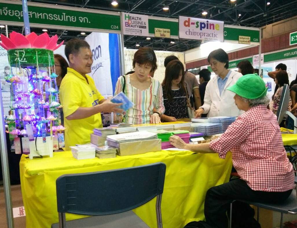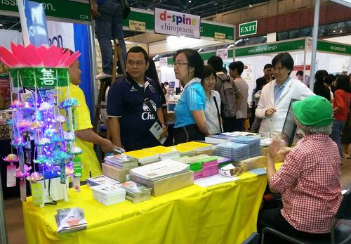 法轮功学员的展位摆放着泰文版法轮大法书籍、真相资料、真相光碟、泰文教功光碟,以及印有法轮功弘传世界的盛况、以及介绍法轮功学员在中国无辜受迫害的落地展布,不断有人前来观看、询问以及了解法轮功在中国受迫害的真相。